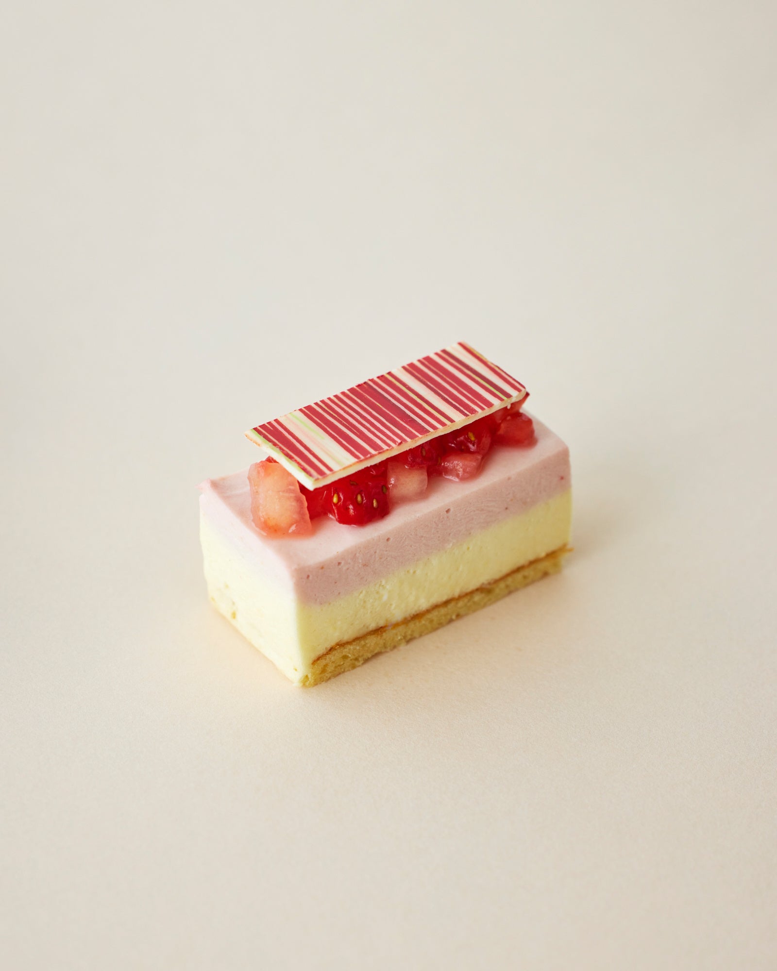 パトリックシェフと共にペストリーキッチンに立つ猪俣俊貴シェフのオリジナルレシピ。マイルドな味わいのストロベリームースと、優しいミルキーな甘さが際立つホワイトチョコレートムースの二層が華麗に重なる、いちごとホワイトチョコレートの絶妙な組み合わせがお愉しみ頂けるスイーツです。二人のパティシエの温かい友情が感じられる、思いの詰まった一品です。