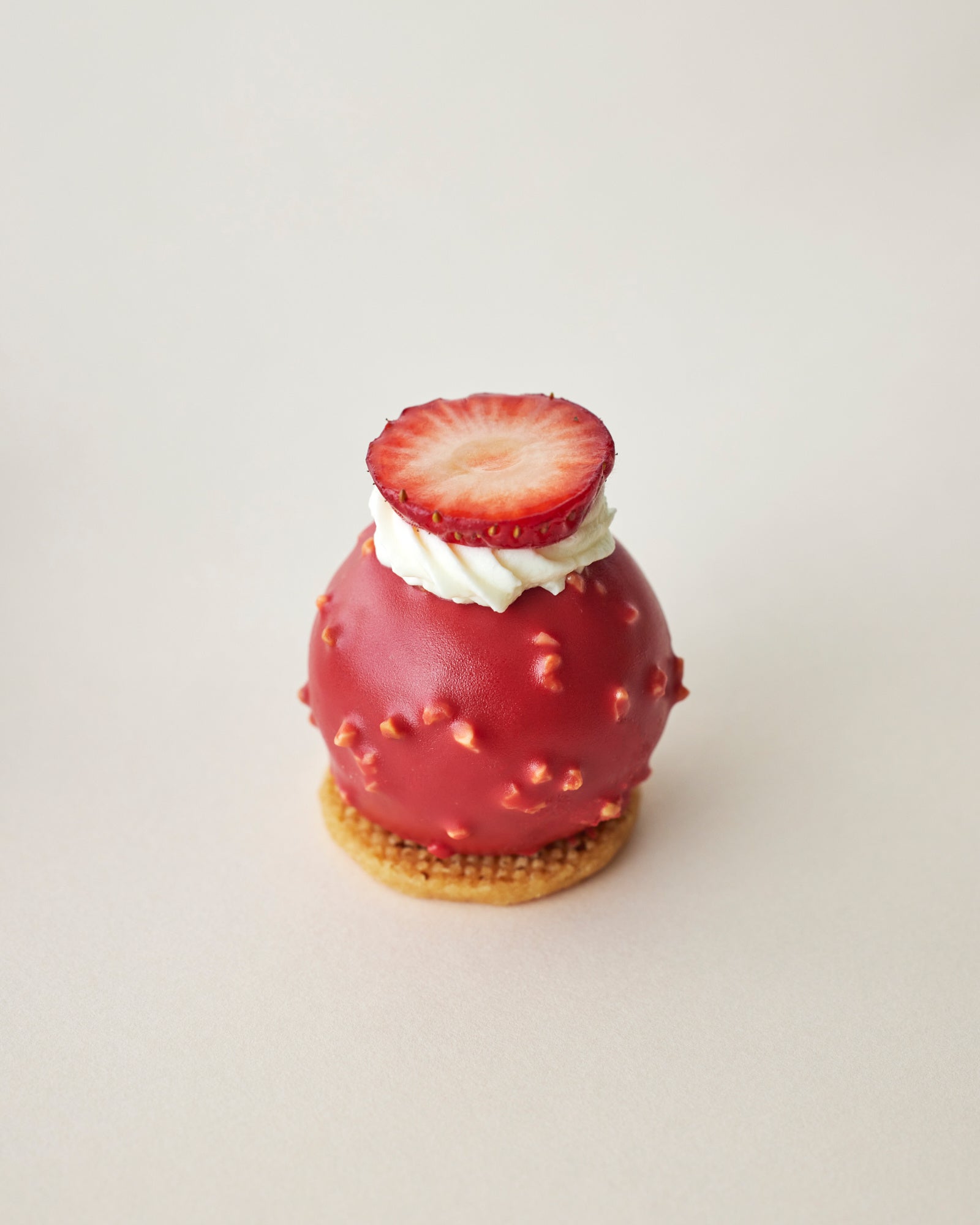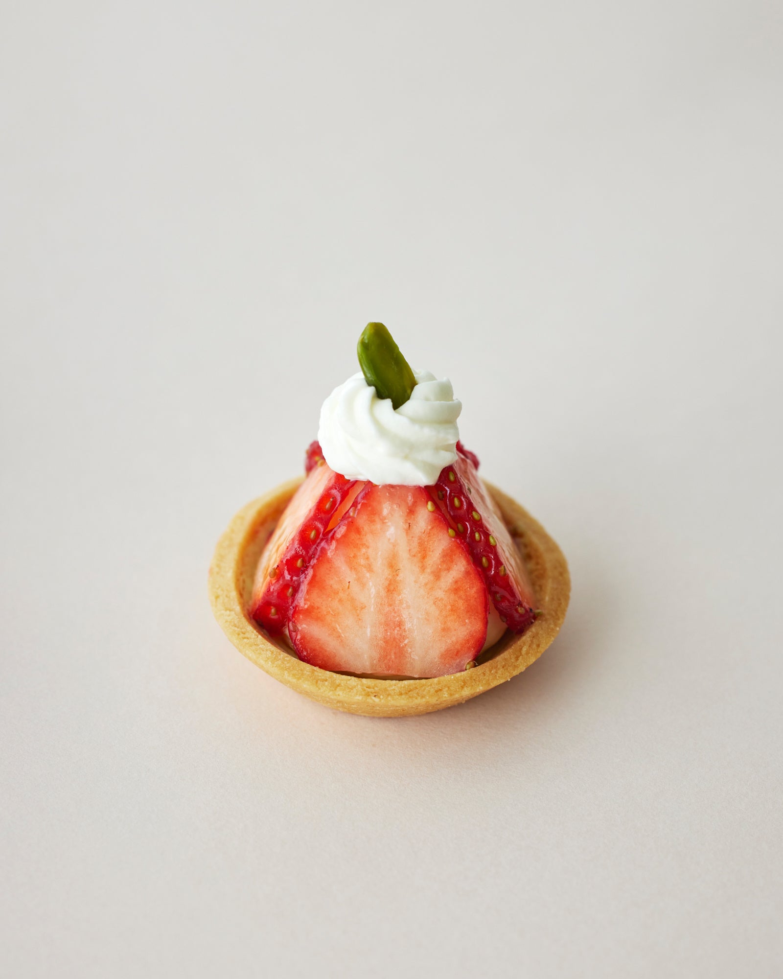 一口サイズのクラシックなストロベリータルト。濃厚なバニラクリームと、丁寧にホイップされたシャンティリークリームの両方を用いており、印象が異なる二つの甘さを同時にお愉しみいただけます。最後にいちごのフレッシュで甘酸っぱい薫りがまとめ役となり、上品な味わいに仕上げてくれるこの伝統的なタルトは、愛の国・フランスを思い出させるバレンタインシーズンにぴったりのスイーツです。