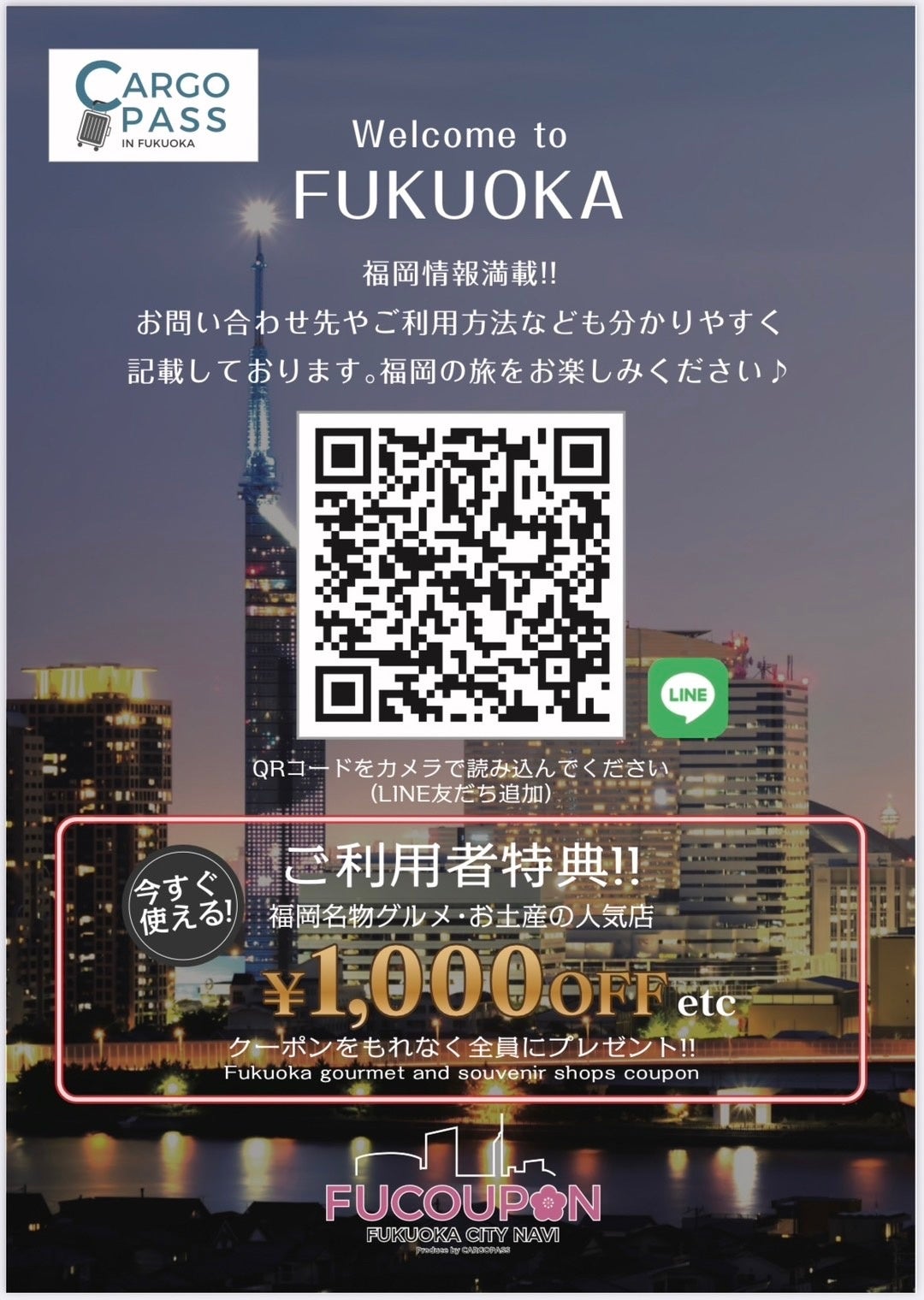 FUCOUPONとは、LINE友だちを追加することで、宿泊先ホテルのWi-Fi情報や館内情報、福岡グルメのクーポン券や観光情報を取得できる。現在友だち数が1万人を超えており、福岡の旅を気軽にお得に便利にしていく独自のサービスを展開中。