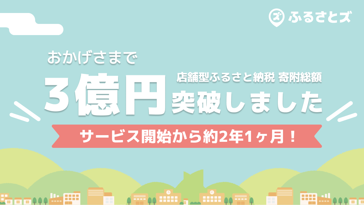 店舗型ふるさと納税(R)『ふるさとズ』の寄附総額が3億円を超えたことをお知らせします。