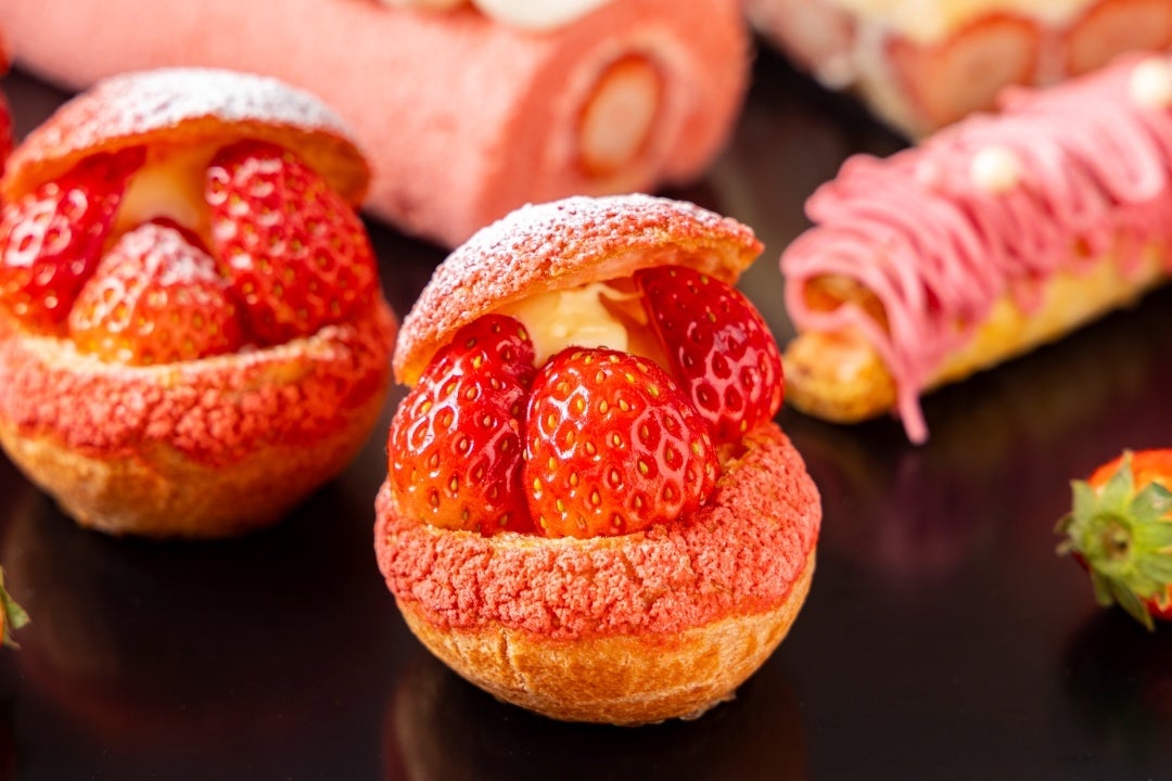 ピンク色に焼き上げたクッキーシューに、フレッシュないちごとストロベリーカスタードクリームをたっぷり詰めました。
