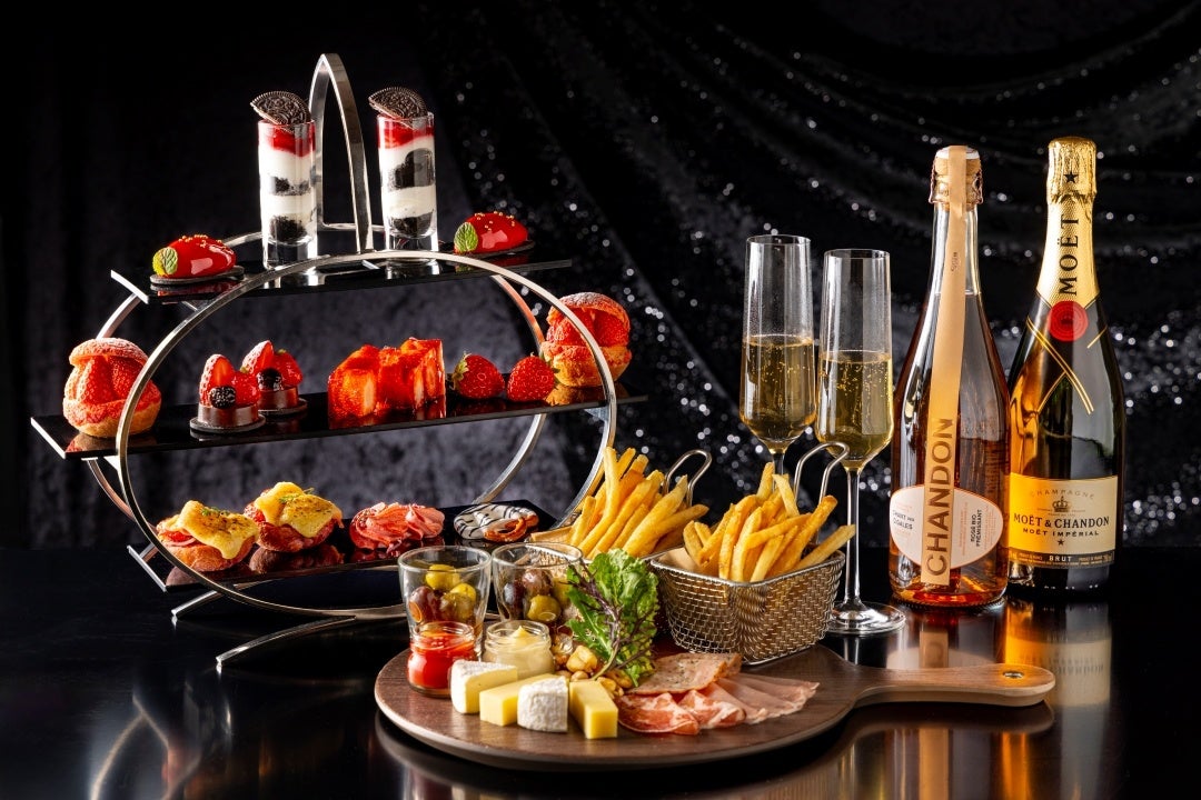 いちごスイーツ8種類、シャルキュトリー、チーズ&ナッツ、トリュフ風味のフライドポテト、オリーブマリネなどのセイボリー8種類をご用意しました。お酒とご一緒にお楽しみいただける飲み放題プランをはじめ、豊富なドリンクオプションもご用意しています。