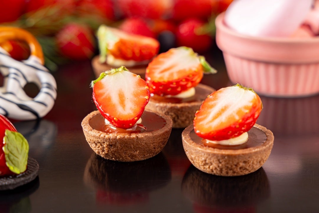 ココア風味のタルト台にグランマルニエ(オレンジのリキュール)風味のチョコレートを流し込み、フレッシュいちごをトッピング。
