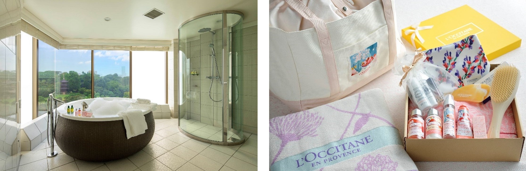 桜の季節限定でロクシタンとコラボレーションした、バスタブから庭園を望むビューバススイートに泊まり、特等席からお花見体験を。お部屋の中からギフトにいたるまでロクシタンのチェリーブロッサムの世界観とともに桜をお楽しみいただけるプランです。