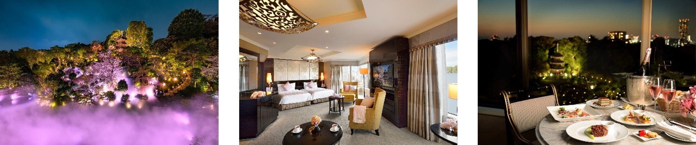 「プレミアムインルームディナー in 桜ビューバススイート」は、庭園を望むビューバススイートにお泊りいただき、バスタブという特等席からのお花見をお楽しみいただけます。お部屋では、通常のバスアメニティではご提供していないロクシタンの桜の香りなどのアメニティをご用意しました。