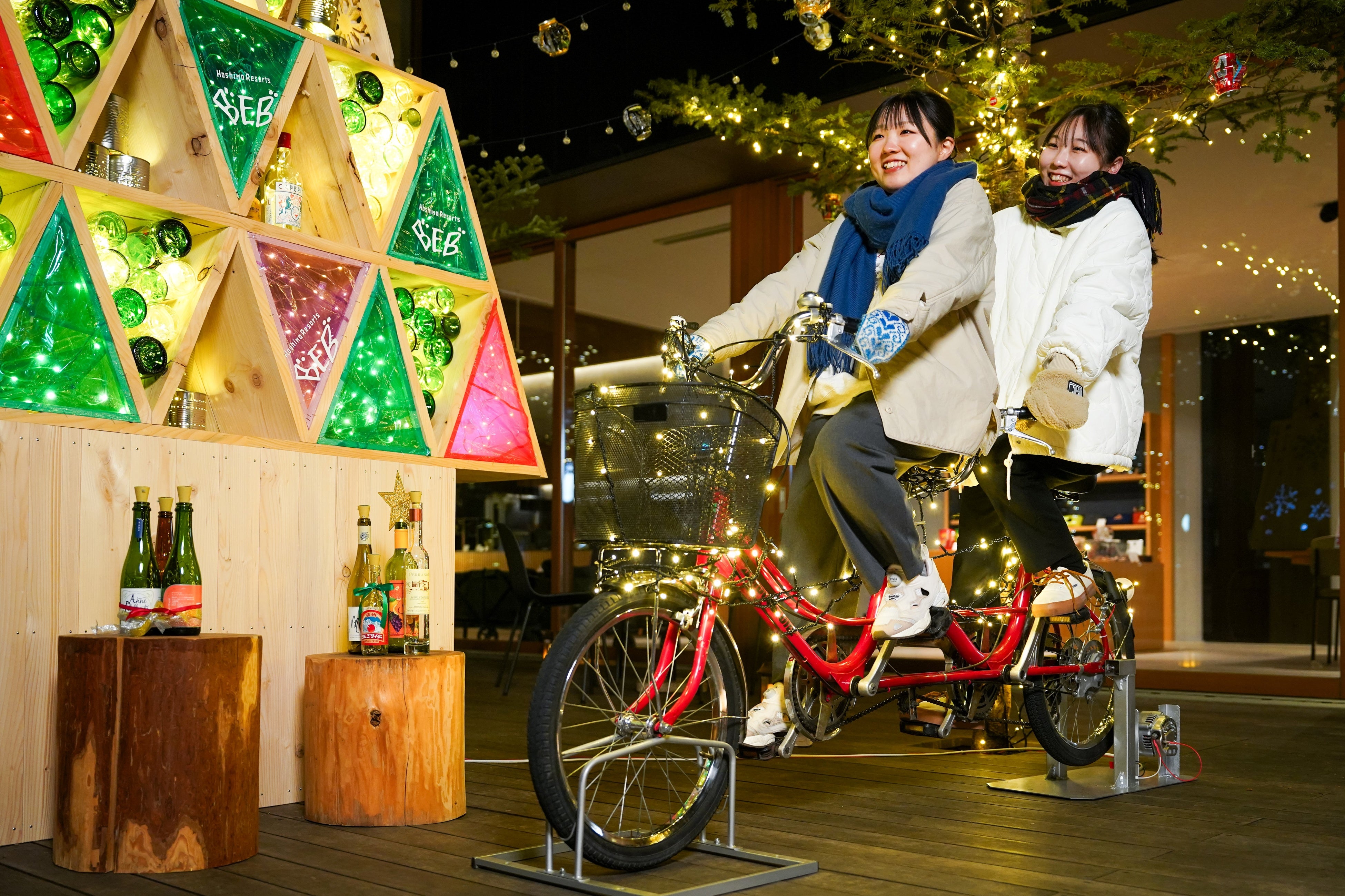 点灯式は、クリスマスツリーの置かれたパブリックスペース「TAMARIBA(タマリバ)」の中庭で実施しました。間伐材を使用して作られた土台に、ホテル運営で生じた缶、瓶、ビニール傘などでカラフルに装飾された高さ3.5mのアップサイクルクリスマスツリーの周りにたくさんの参加者が集まりました。中庭にはサステナブルクリスマス完成までのストーリーをまとめたショートムービーが流れ、会場全体が感動と期待に包まれました。こげばこぐほどよりクリスマスツリーが光る、タンデム自転車発電による点灯は、BEB5軽井沢の企画担当者と長野県佐久平総合技術高校の生徒さんが務めました。高校生のカウントダウンを合図に装飾された100本以上の缶や瓶が一斉に点灯し、自転車発電でさらに輝きがましたところで参加者から歓声が沸き上がりました。