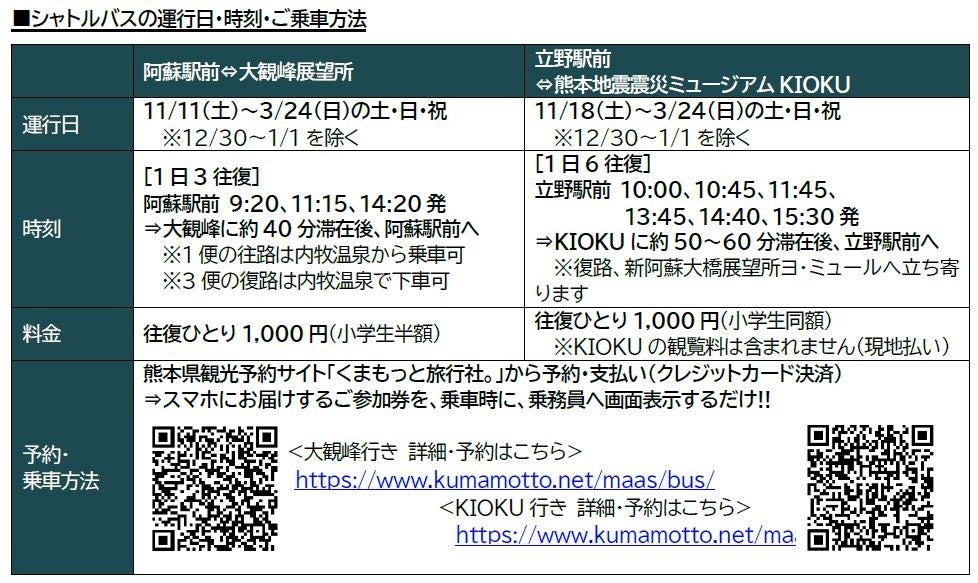 11月11日(土)からJR阿蘇駅前発「大観峰」行き、11月18日(土)から、JR・南阿蘇鉄道立野駅前発「熊本地震震災ミュージアムKIOKU」行きシャトルバスの運行が始まり、車がなくても、お得に便利に阿蘇観光ができるようになりました。