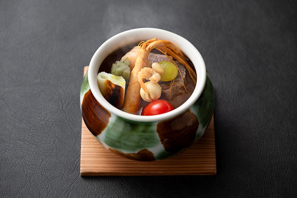 □吸物 名物美濃薬膳スープ 飛騨牛/高麗人参/松の実/蓮の実/干し海老/干し貝柱/沢アザミ/徳田葱/藤九郎銀杏/