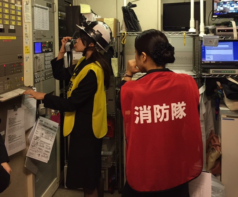 訪日外国人客が増える中、防災訓練に4カ国語(日本語・英語・中国語・韓国語)での避難誘導を実施。訓練では、実際に地震および火災が発生した想定で、非常放送・避難指示、出火階および直上階の避難誘導などのほか、AED応急救護訓練を行い、有事の際の迅速な対応を可能にしています。