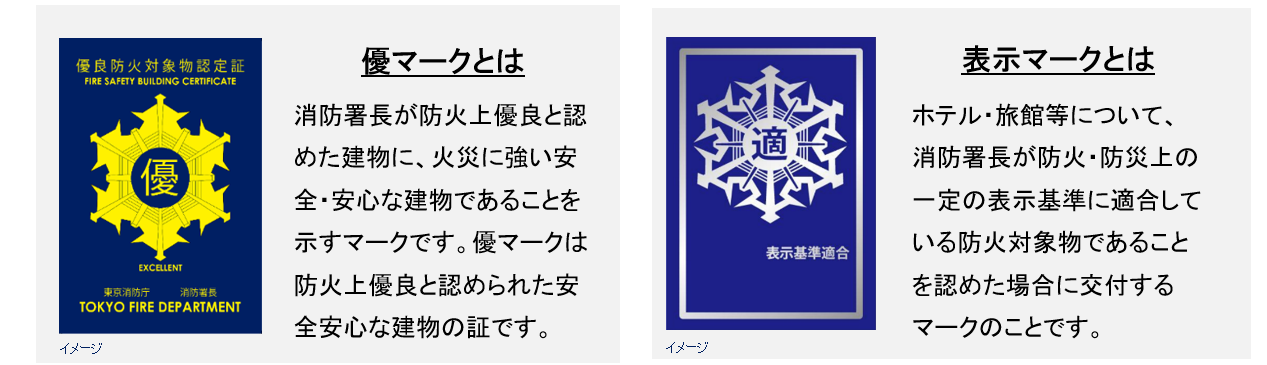 当社は認定基準に適合する優良な防火対象物で あるものとして東京都内、各消防署より認定を受けています(一部ホテルを除く)。また、その証として優良防火対象物認定証(優マーク)を建物出入口・受付などに表示し ております。