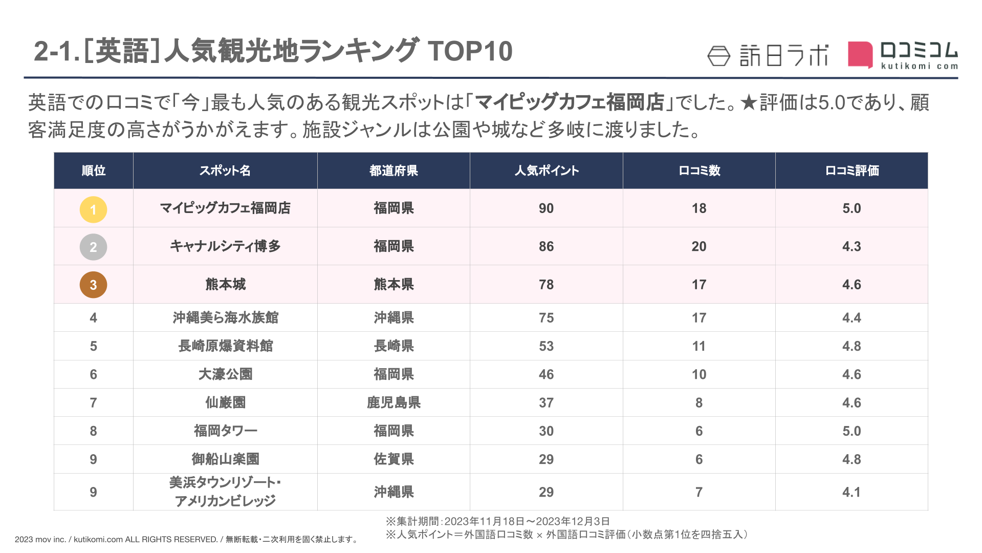 英語での口コミで「今」最も人気のある観光スポットは「マイピッグカフェ福岡店」でした。★評価は5.0であり、顧客満足度の高さがうかがえます。