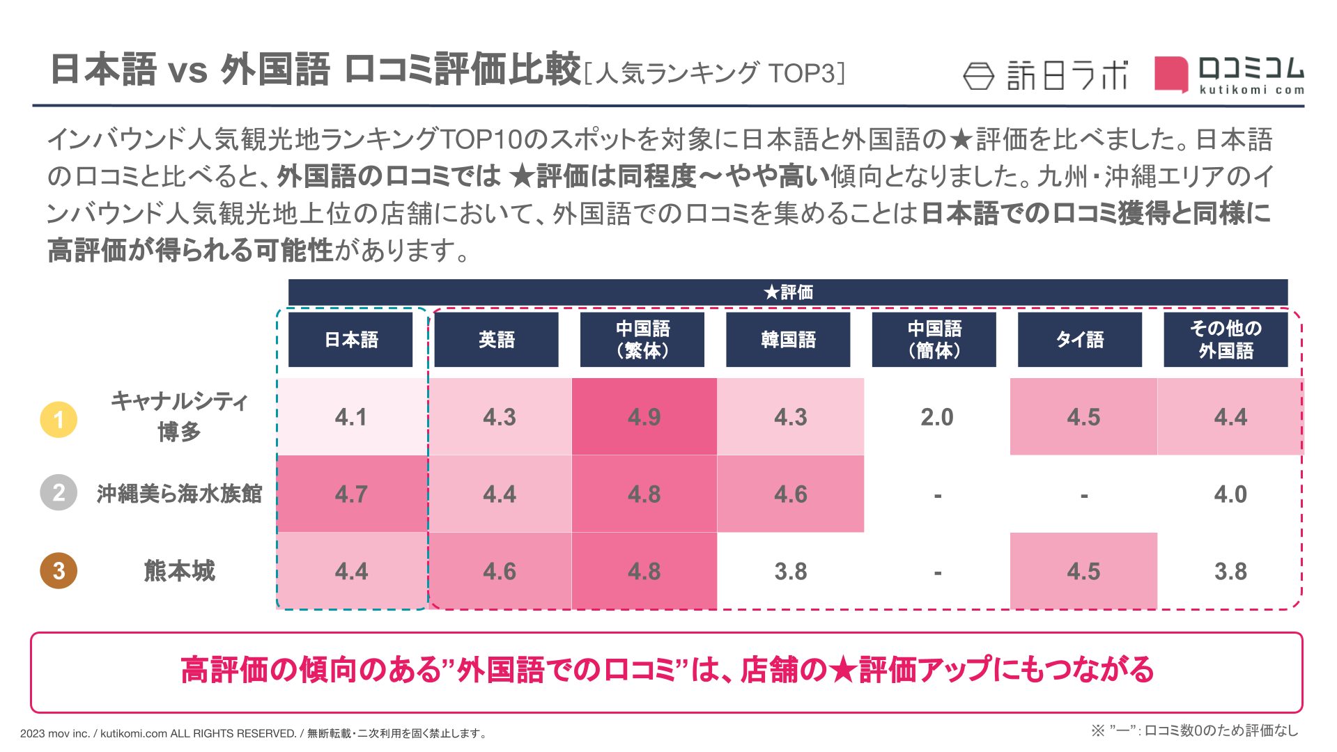 日本語の口コミと比べると、外国語の口コミでは ★評価は同程度〜やや高い傾向となりました。九州・沖縄エリアのインバウンド人気観光地上位の店舗において、外国語での口コミを集めることは日本語での口コミ獲得と同様に高評価が得られる可能性があります。
