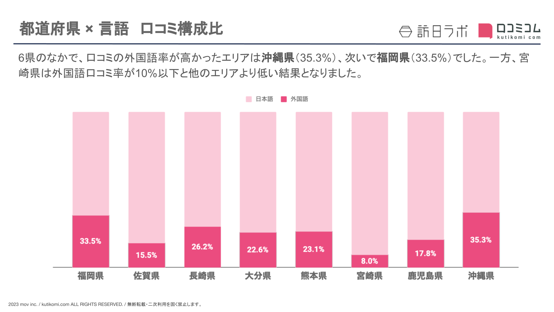 8県のなかで、口コミの外国語率が高かったのは沖縄県(35.3%)、次いで福岡県(33.5%)でした。一方、宮崎県は外国語口コミ率が10%以下と他のエリアより低い結果となりました。