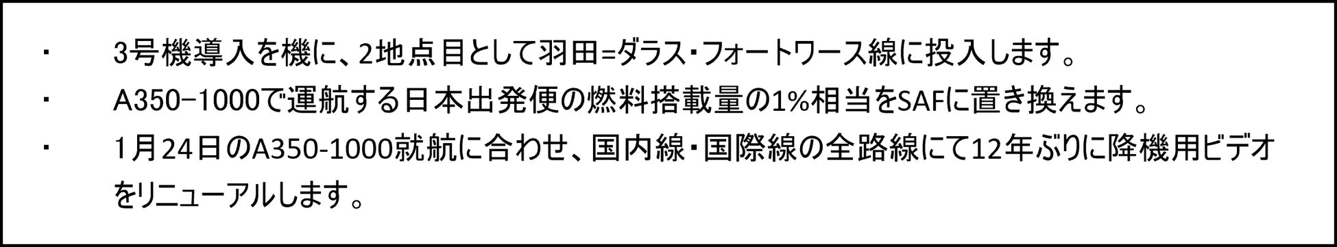 JALは今後も、最高の快適性と最新の環境性能を兼ね備えたA350-1000の導入を進め、お客さまの快適性とサステナブルな未来を実現してまいります。
