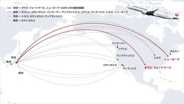 JALは、国際線の新型機エアバスA350-1000型機(以降、A350-1000)の羽田=ニューヨーク線(JL006/JL005)への就航を2024年1月24日より開始します。また、2号機を2023年度内に導入し、当該便をA350-1000で毎日運航します。さらに、3号機の受領後は、2地点目として羽田=ダラス・フォートワース線に投入することを決定しました。