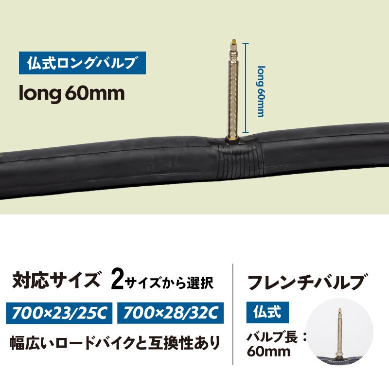 ロードバイク、クロスバイクやグラベルなどの700Cタイヤ対応のチューブ。