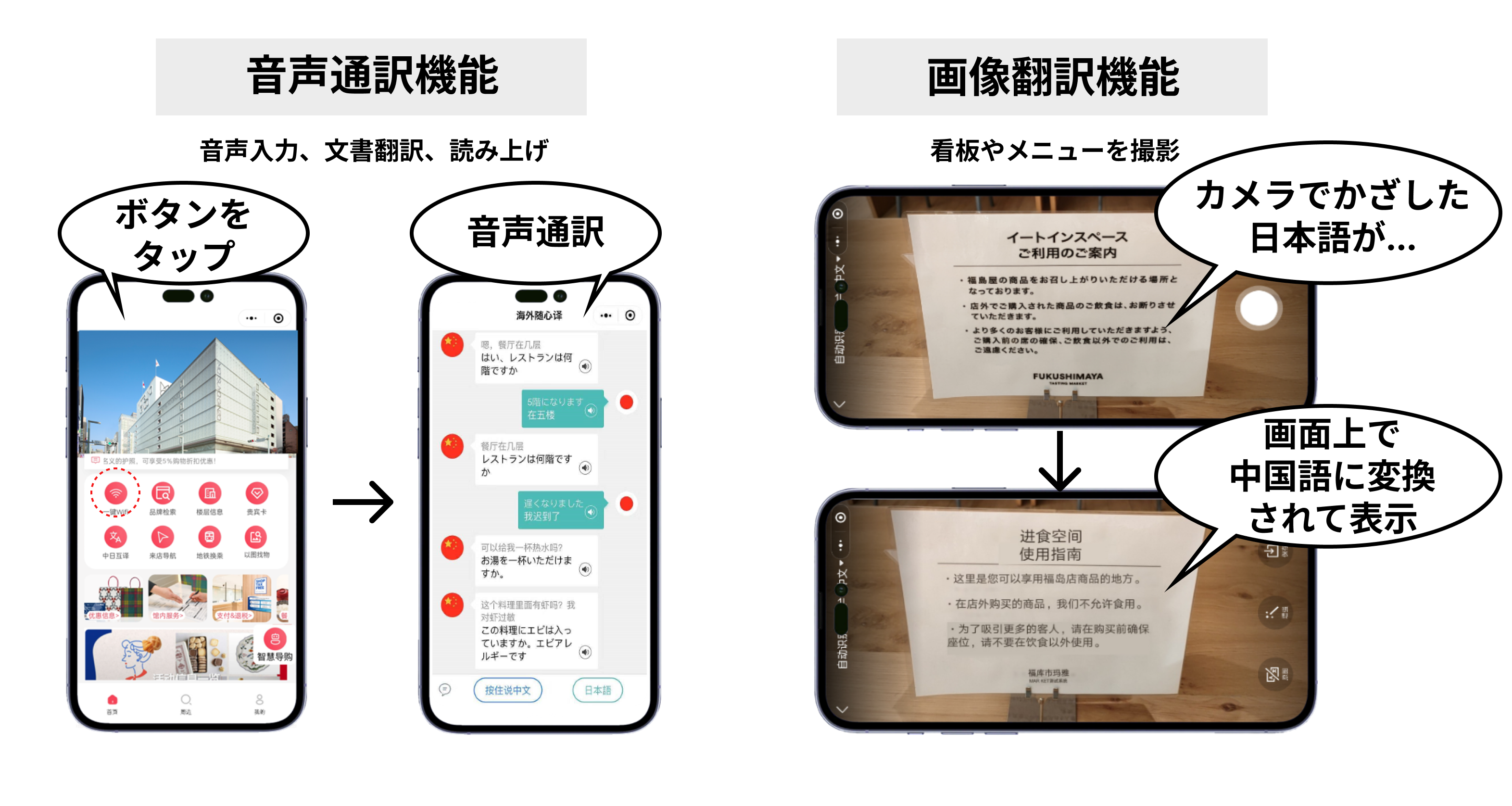 本施策は、2023年に好調な復活を遂げた百貨店業界の中でも、特に来店・売上比率が高い中華圏からのインバウンド観光客のお客様に対して、予期しない人手不足や来店客急増により、百貨店が強みとする「お客様への丁寧な対応」が実施出来ない状況下であっても、スマート接客施策で快適・安心して商品購入機会をご提供するために導入推進が行われます。