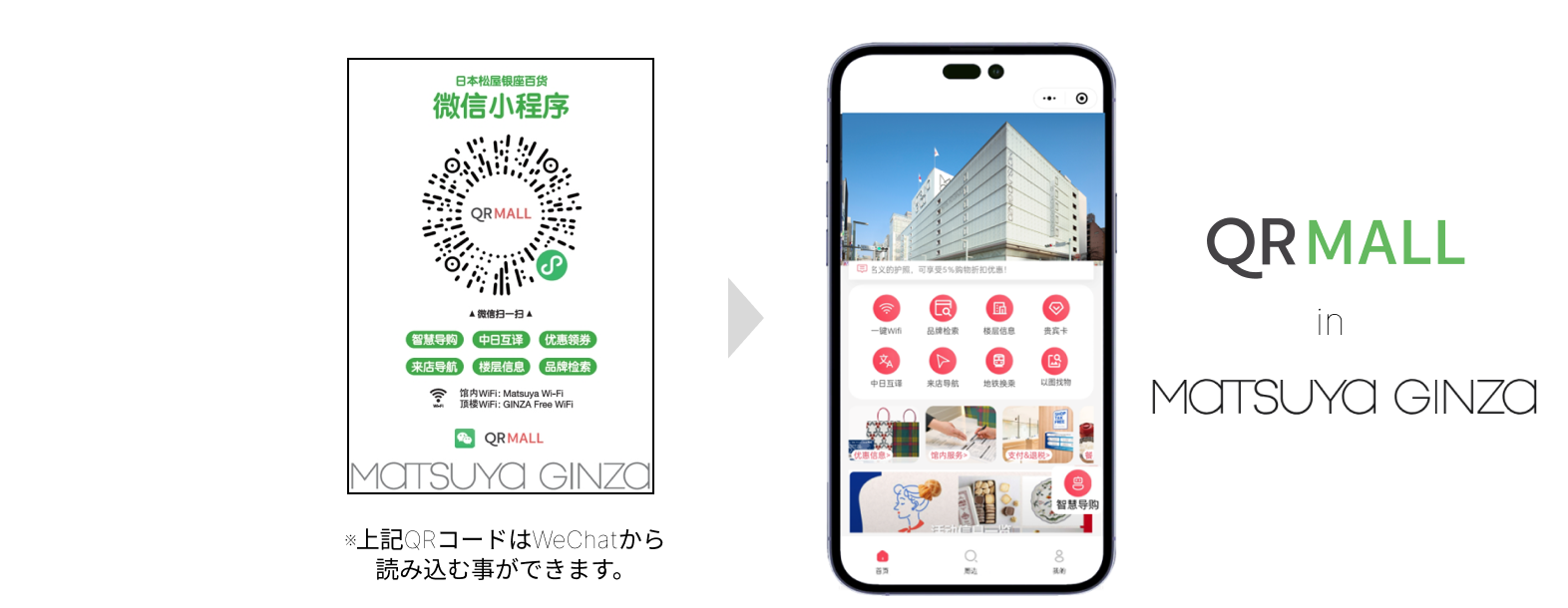 QRMALLを活用したスマート接客は、お客様のスマートフォン上の松屋銀座専用「スマート接客アプリ」からサービスが提供されます。本アプリは中華圏で非常に浸透度の高い中国No.1 SNS「WeChatミニプログラム」上で構築されています。ご利用に際しては、WeChatダウンロード済みのユーザーは新たにアプリのダウンロードを必要とすることなく、専用QRコードを読み取るだけですぐに使うことができる、中華圏観光客にフレンドリーなサービス設計となっています。