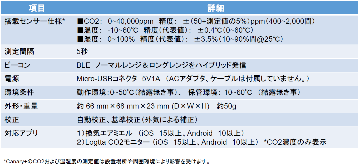 当社は2017年から高性能のCO2センサーの開発・販売を手がけ、保育園や幼稚園などでのインフルエンザ感染予防対策としてCO2濃度を換気の指標として活用する事をご提案させていただいております。Canary+はより多くの一般の方にもご利用いただけるよう小型化、軽量化、低コスト化した新製品です。
