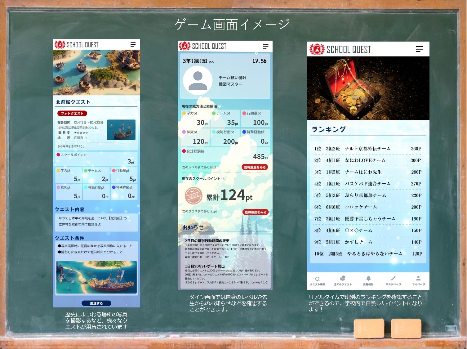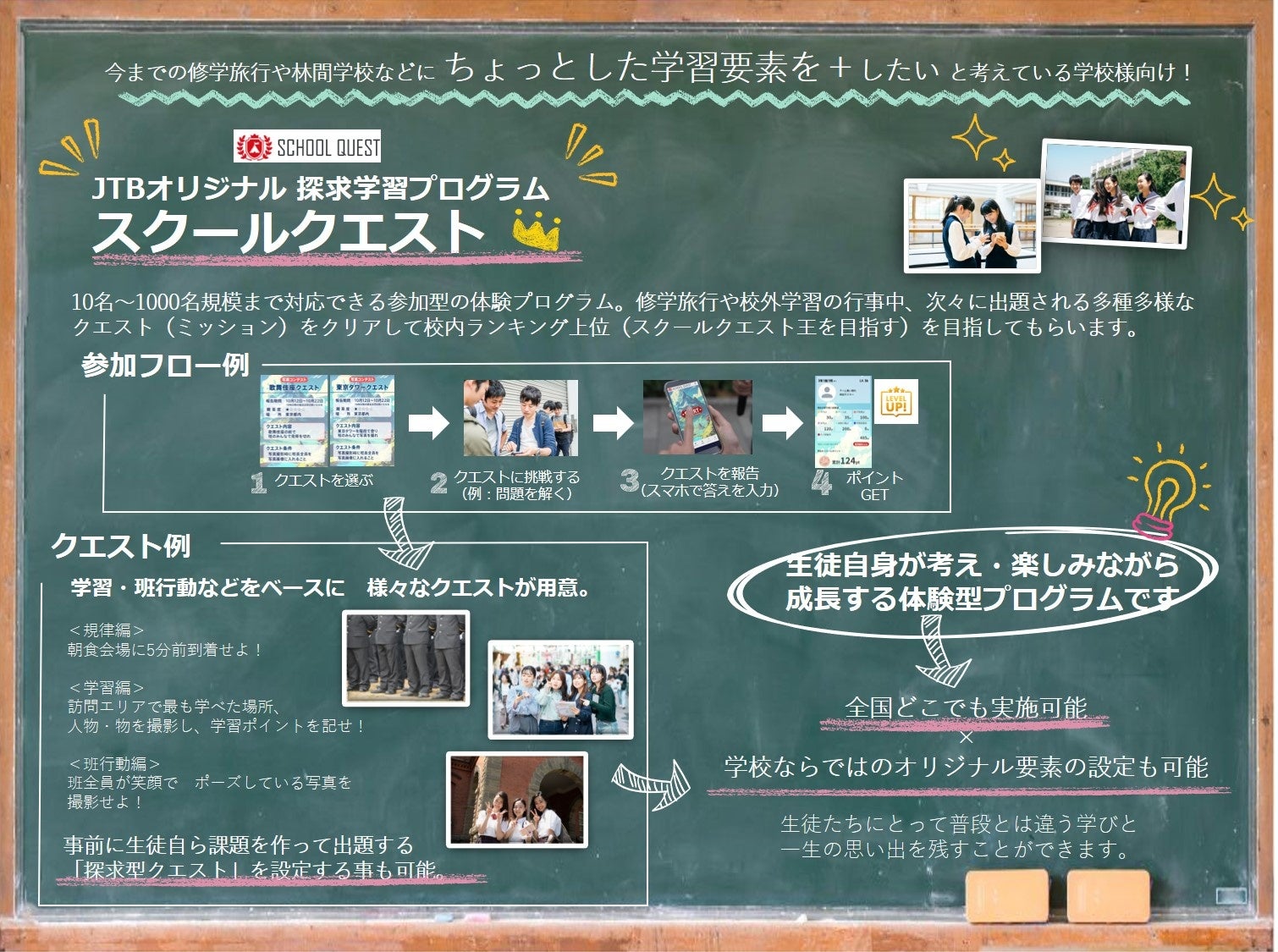 修学旅行や遠足、校外学習を実施の際、自らテーマとする項目をクエスト(ミッション)として事前に設定し、そのクエストをクリアする毎にポイントが付与され、旅行中に獲得したポイントを積み上げ、競い合うゲーム感覚で探究心を養えるオリジナルプログラムとなります。