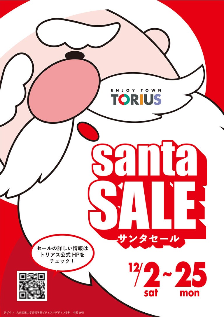 九州産業大学芸術学部ビジュアルデザイン学科の学生さんにポスターデザインを49点制作していただき、「トリアスサンタセール ポスターデザインコンクール」を行いました。その中で最も票を集めたデザインを今年のサンタセールのポスターに決定いたしました!詳細ページ:https://torius.com/event/54693/