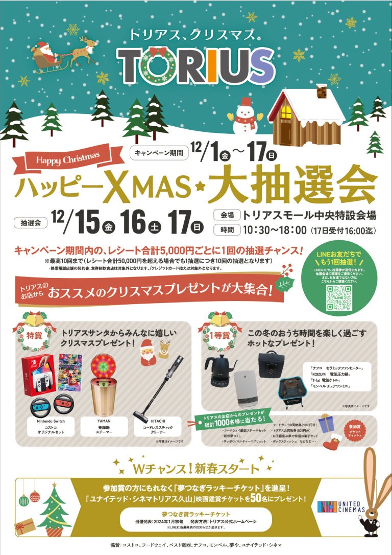 総勢1,000様にトリアスサンタからのプレゼント!キャンペーン期間内でレシート合計5,000円ごとに1回の抽選チャンス!豪華家電や大人気ゲーム機など、店舗からのおススメ賞品をゲットしよう!詳細ページ:https://torius.com/event/75059/