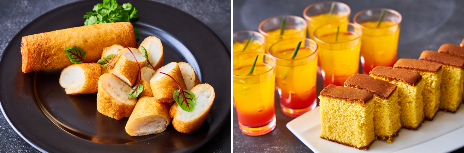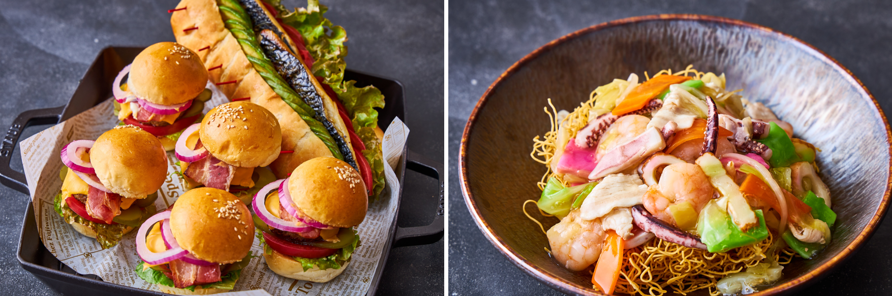 日本料理・西洋料理・中国料理・スイーツの各専門シェフが、長崎県の食材や調理法などのエッセンスを取り入れた料理をご用意します。日本料理では、身が締まり脂がのりだす旬のきびなごを天婦羅にしてご提供します。一般的に天つゆで食べられる天婦羅と異なり、小麦粉に砂糖や酒などを加えた衣をつけてカリっと揚げるフリッターが原型とされる“長崎天ぷら”をベースにしています。衣は厚く味がついているため、そのままお召し上がりいただけます。西洋料理では、すき焼き風に薄くスライスした牛肉を焼き上げ、焼き上がる直前にレモン果汁が入ったソースで仕上げる佐世保市の名物料理「レモンステーキ」や、「佐世保風バーガー」、新名物「鯖サンド」をお楽しみいただけます。中国料理では、長崎名物の麺料理「皿うどん」や、郷土料理「ハトシ」をご堪能いただけます。ハトシ(蝦多士)は“エビ(蝦)”・“トースト(多士)”の意味で、エビのすり身をパンで挟んで油で揚げた料理を意味します。パン生地はサクッと中はフワっとした食感が特徴です。スイーツでは長崎銘菓の代表である「長崎カステラ」や特産品のみかんを使用したゼリーをご賞味いただけます。東京と長崎の食の違いを感じることができる料理の数々をぜひご堪能ください。