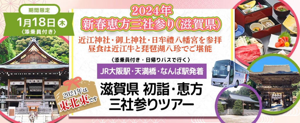 おひとり様12,300円 1月18日(木) 【滋賀県】〈大阪駅・天満橋・なんば発着・添乗員付き〉令和6年新春恵方三社初詣 新春の恵方東北東の三社(近江神宮・御上神社・日牟禮八幡宮)ご参拝+近江牛のすき焼きのご昼食日帰りバスツアーのオンライン販売を開始しました。