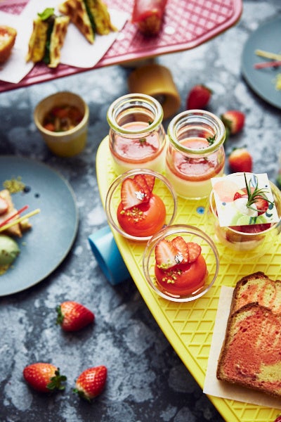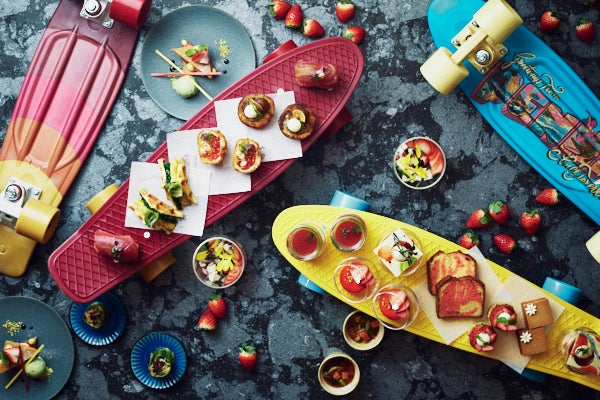 ホテルインディゴ東京渋谷11階に位置する「Gallery 11」では、いちごを存分に味わうことのできるパティシエ特製のストロベリースイーツと、レストランシェフ特製のセイボリーを、渋谷のストリートカルチャーを想わせるスケートボードに載せてご用意します。厳選された国産いちごをふんだんに使用し、芳醇な甘酸っぱい香りとともに7種類のスイーツをお愉しみいただけます。セイボリーはGallery 11のメニューをぎゅっと凝縮したような、地中海料理をベースに日本のツイストを効かせたアイテムをご提供します。