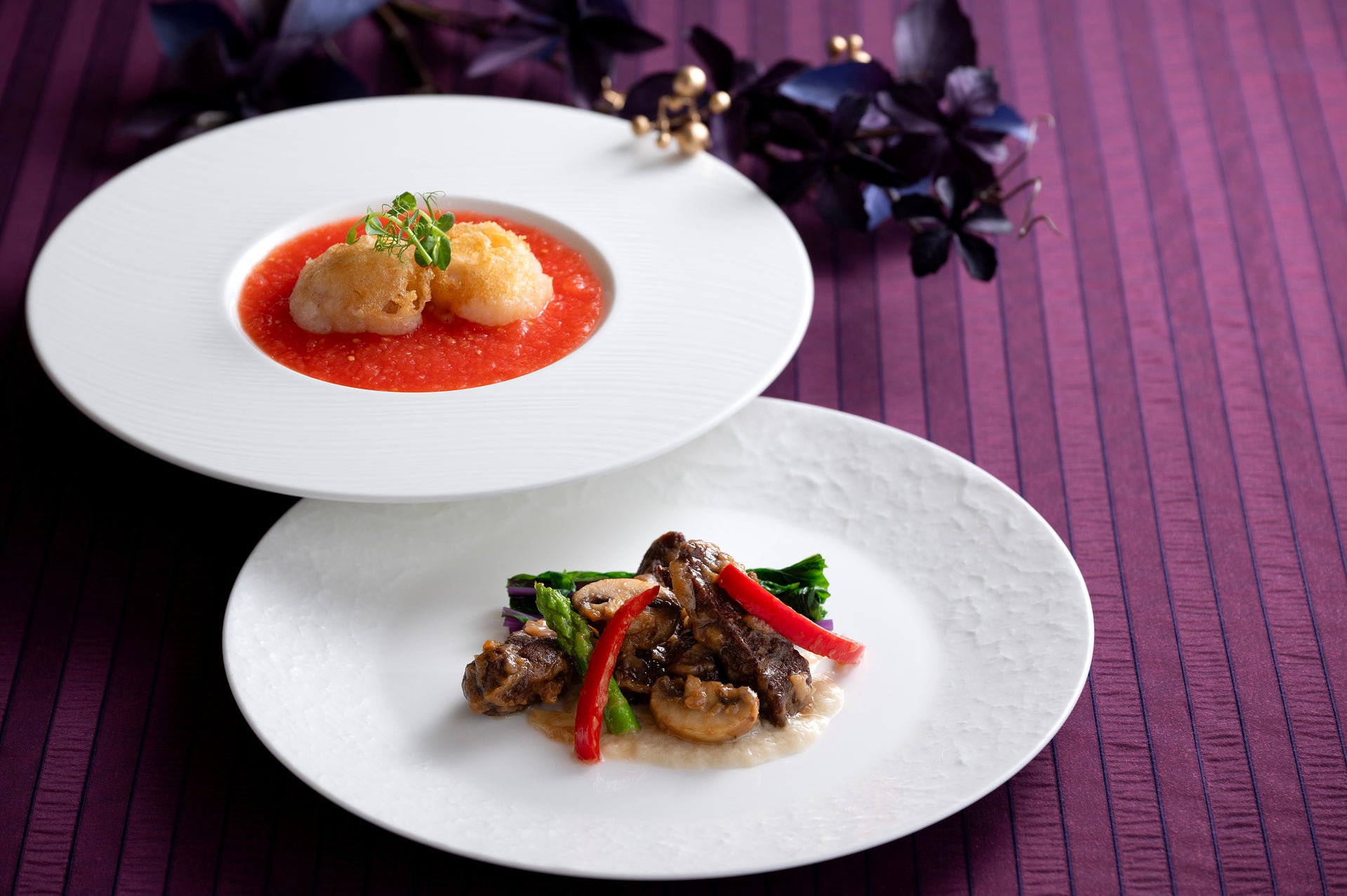 爽やかな酸味の発酵トマトソースが、甘く濃厚な北海道産帆立貝の風味を引き立てる一品をディナーで。ランチには帆立貝の旨味に明太子が絡んだ、味わい深い一品をご用意しました。