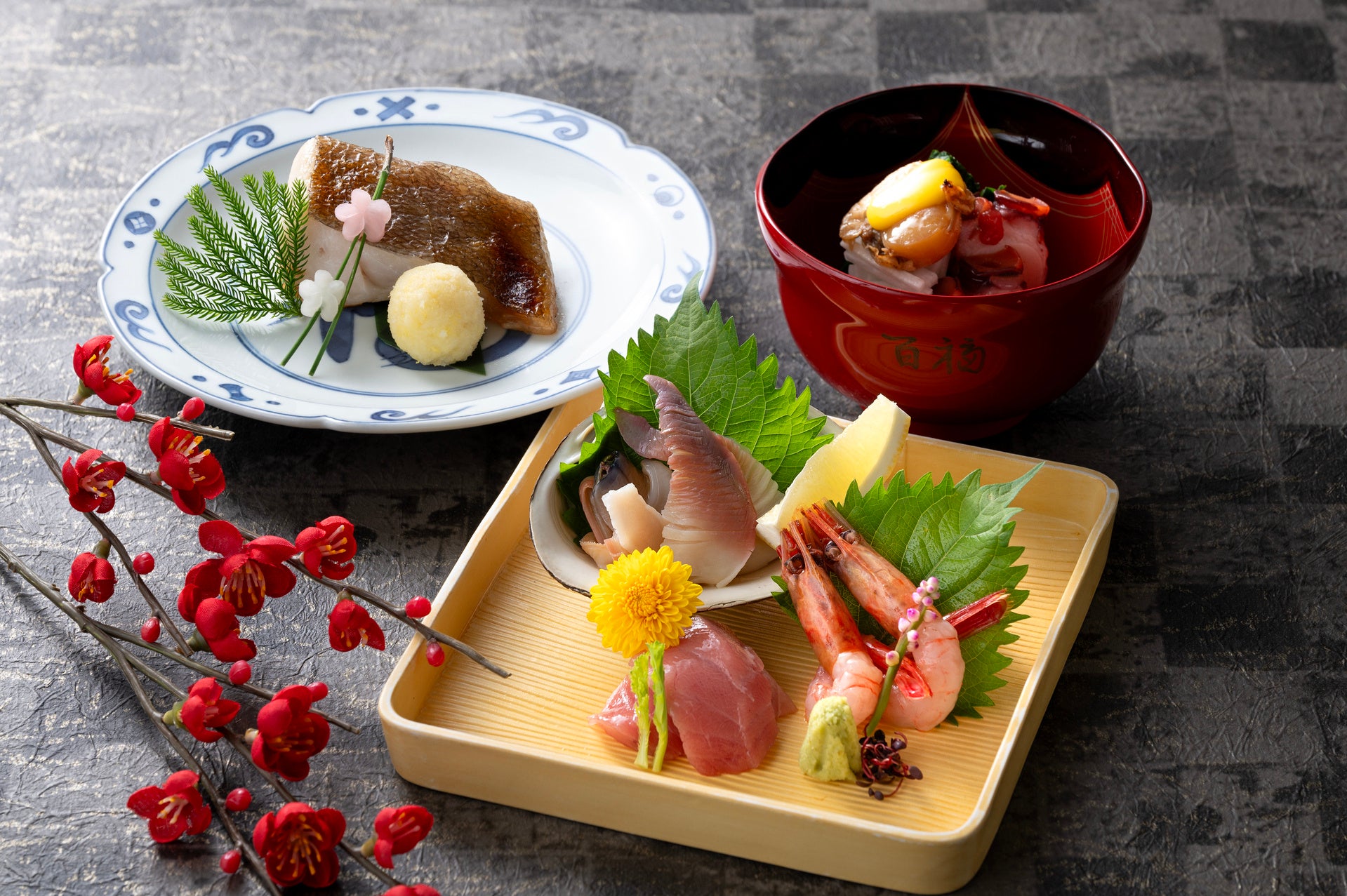 マトウダイ塩焼、北寄貝、帆立貝の酢の物 蛸柔煮梅肉かけ(2月ディナー)