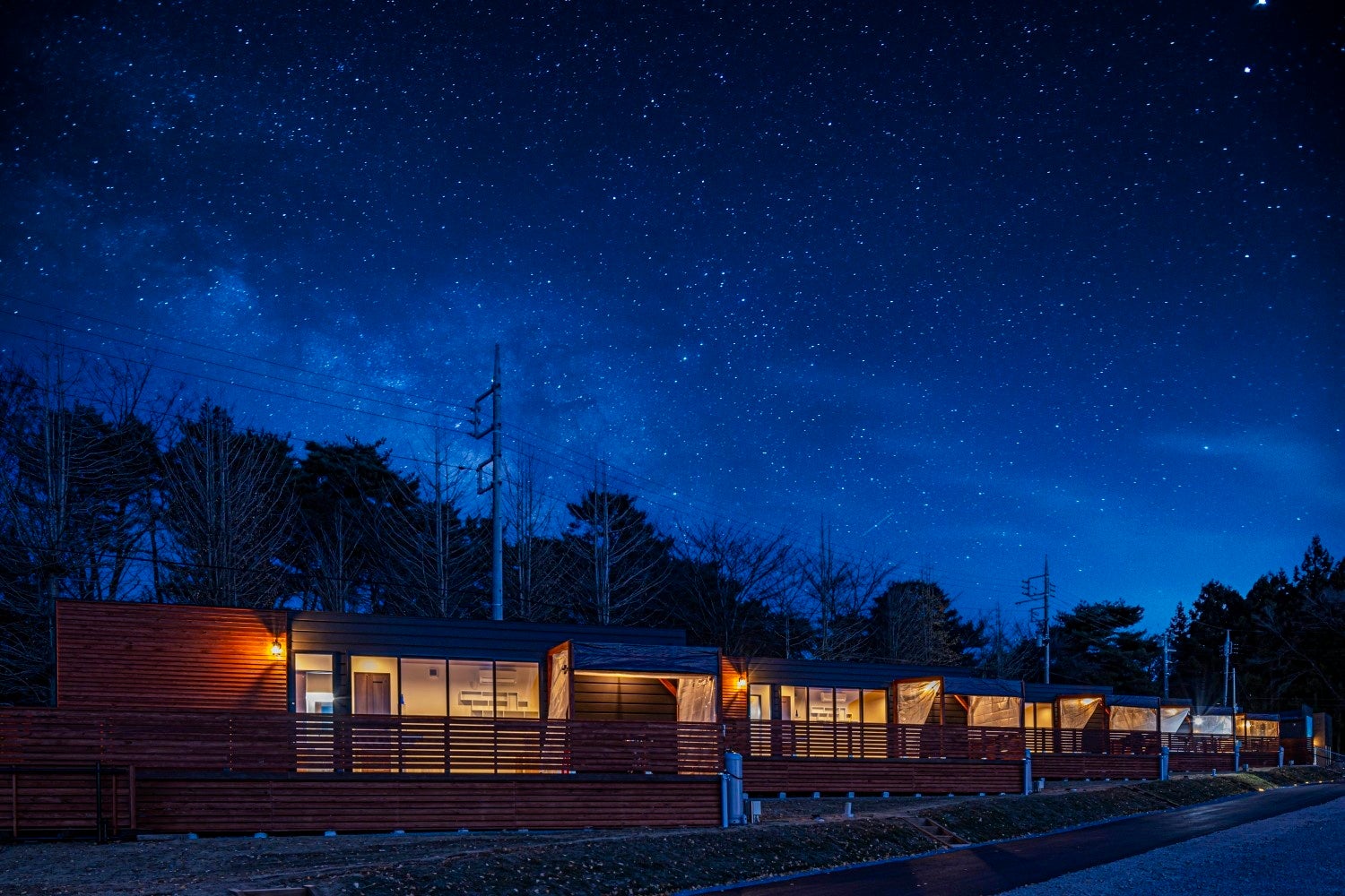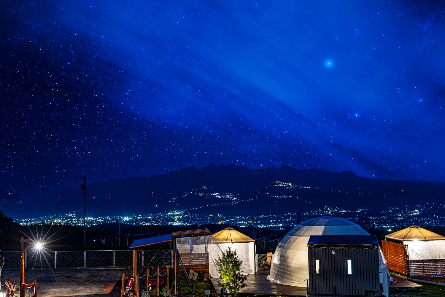 榛名山の裾に広がる渋川、伊香保の夜景、満天の星空を望む丘に佇む、全10棟のリゾート施設