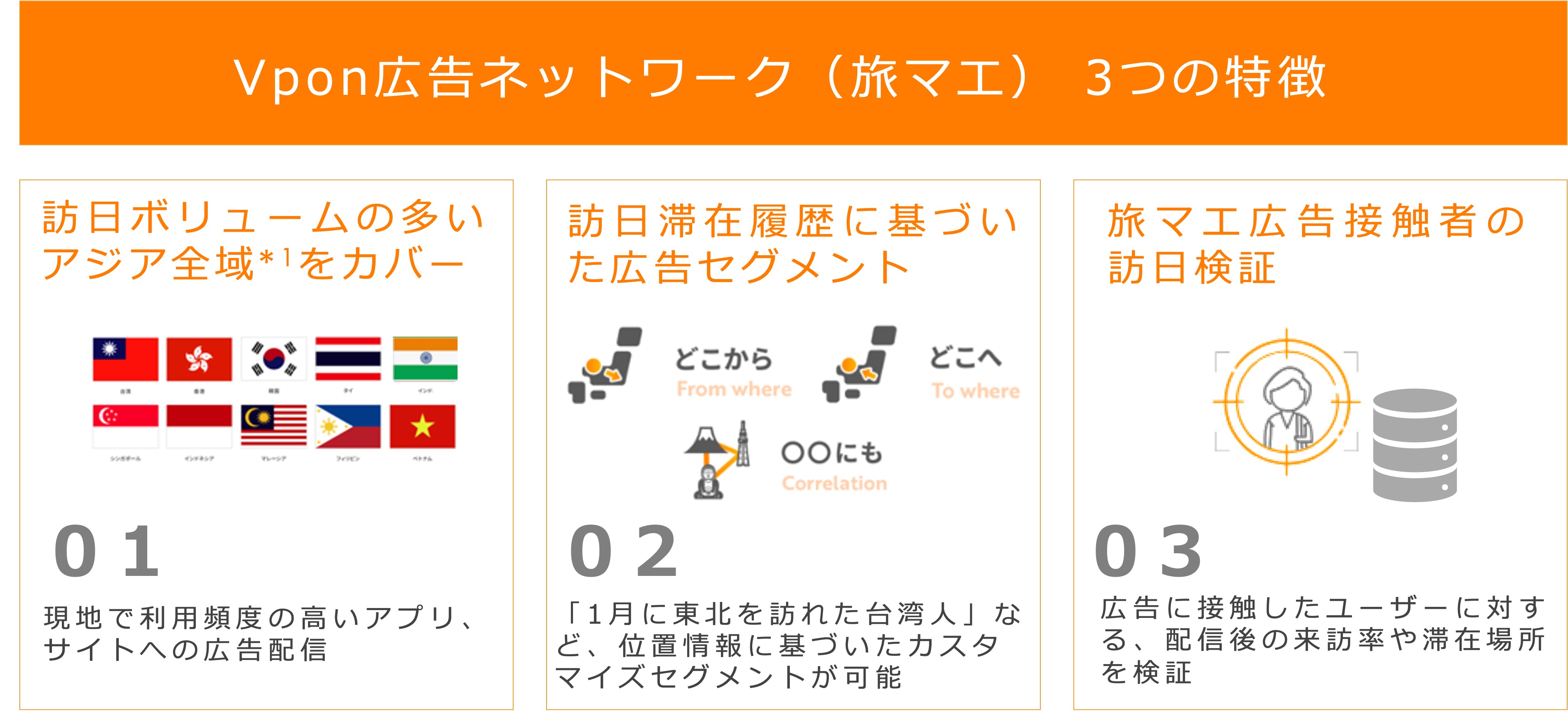 Vponはアジア全域にわたるモバイル広告プラットフォームを展開し、これまでに訪日客および潜在的な訪日客を対象に、「旅マエ」「旅ナカ」モバイル広告配信サービスを提供してまいりました。