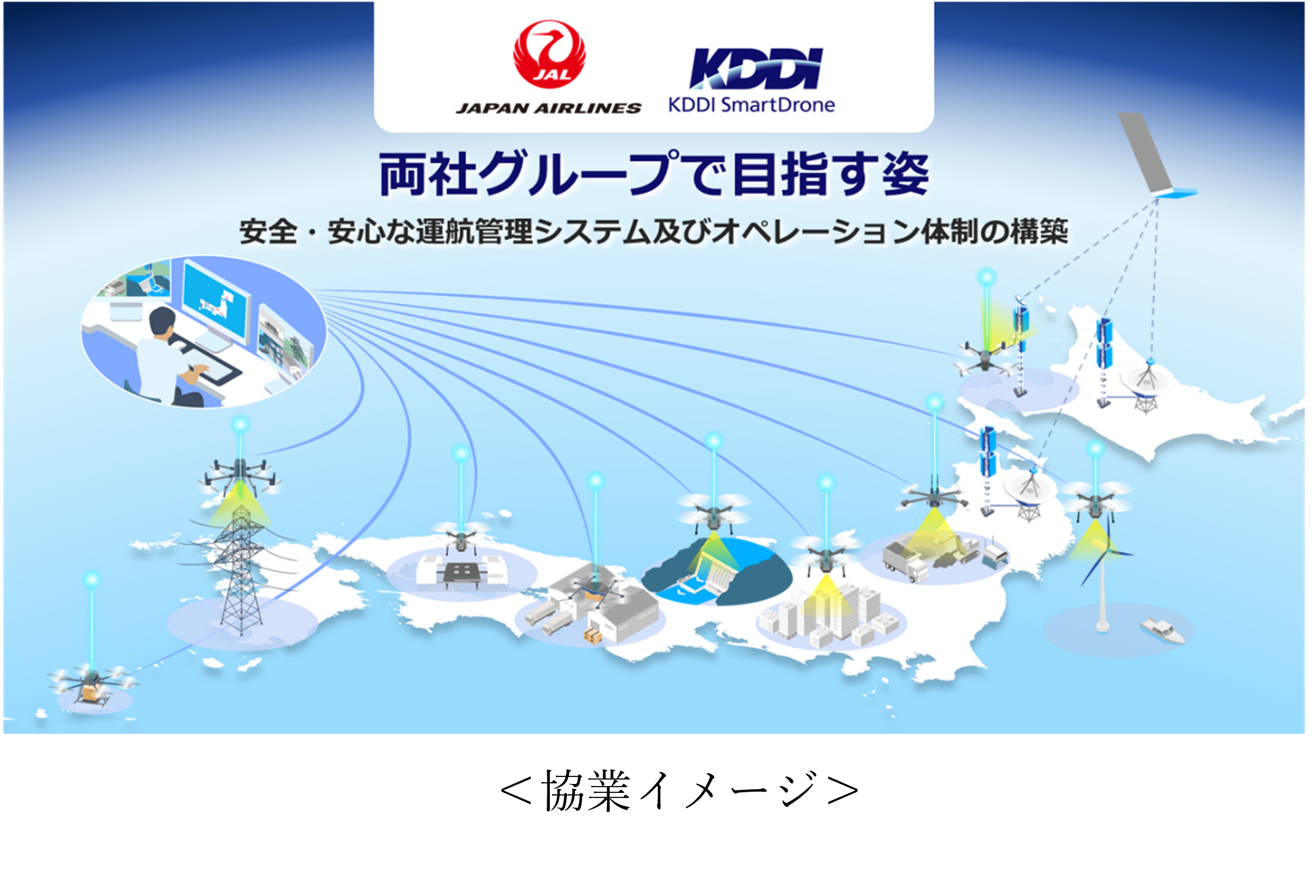 JALが培ってきた空の移動に関わる安全管理などの航空運送事業の技術・知見と、KDDIとKDDI スマートドローンのドローンの飛行制御から空域管理までを実現する運航管理システムや通信インフラ、そして各社が蓄積してきたドローン運航に関わるノウハウを活かして、高度なドローン活用の実現と利用の拡大に向けた取り組みを加速すべく、提携に至りました。