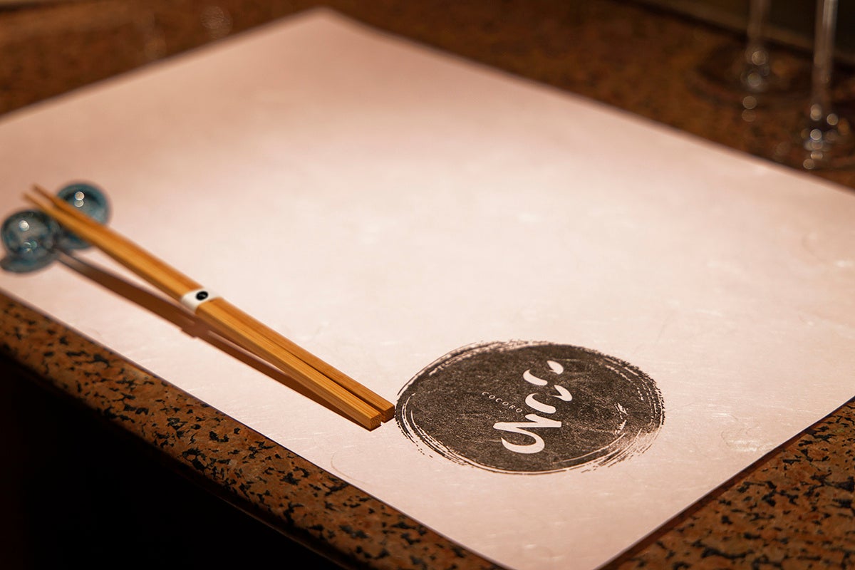 また、鉄板焼きカウンターでは、スタッフが食事用のマットとして使用する和紙に店舗印を丁寧に押す光景が広がります。その印は、昭和19年創業で、小樽職人の会にも名を連ねる「松田印判店」の作です。