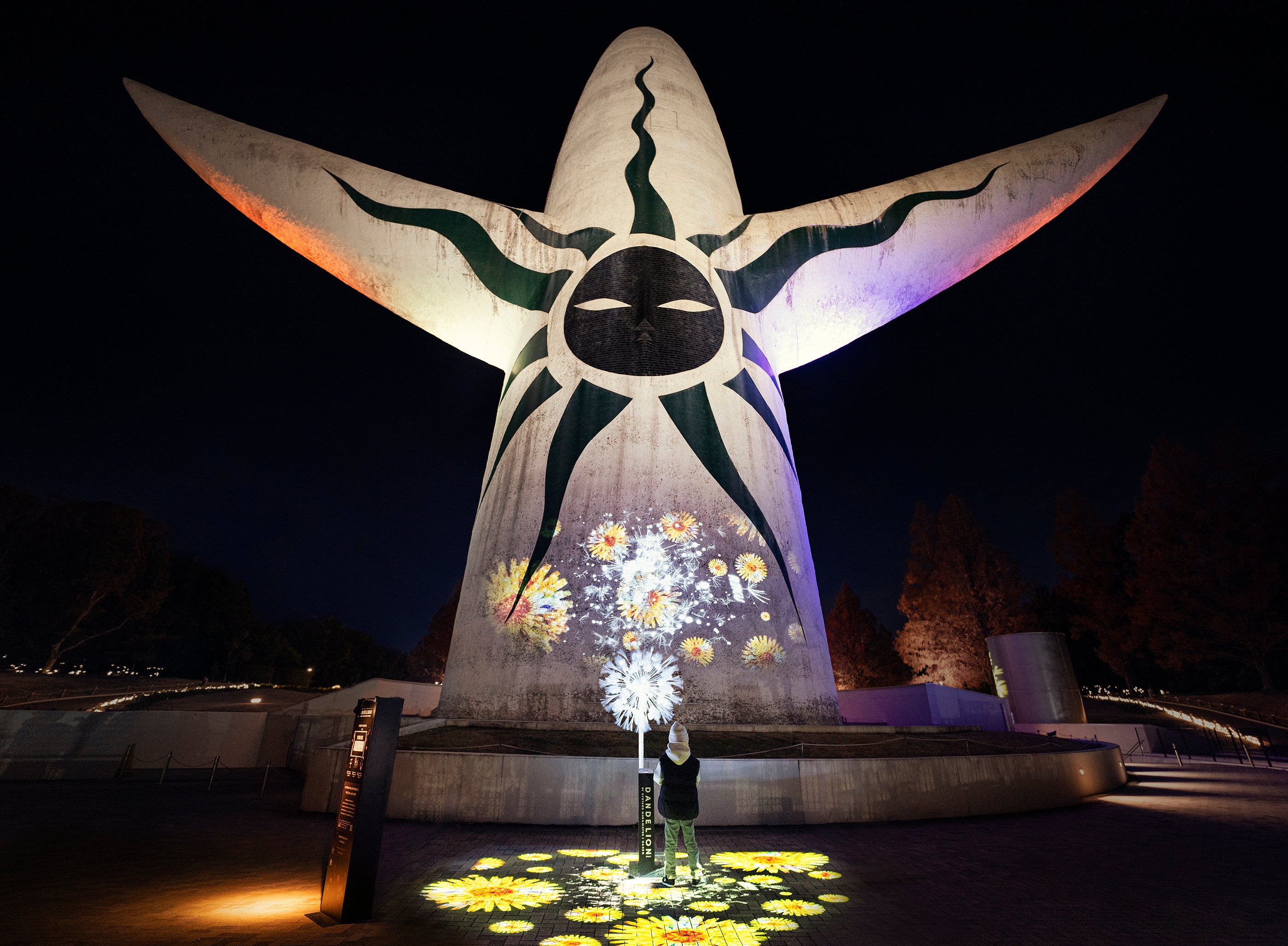 1970年の大阪万博会場跡地である万博記念公園では、芸術家・岡本太郎氏のアート『太陽の塔』の北側(黒の太陽の顔前)に12月25日まで展示中。前回の大阪万博から2025年の万博に向けて調和の想いを引き継ぎ、DANDELIONが国/宗教/人種など様々な区別・隔たりを超えて大阪に集まる世界中の人々を繋げます。