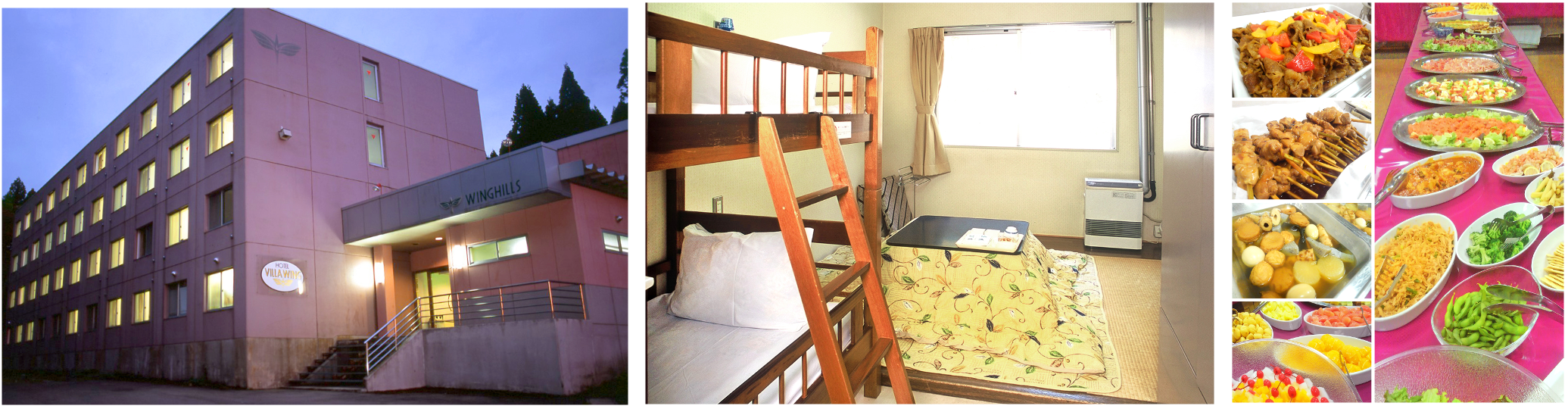スキーヤーズベッド、1室4名まで宿泊可能。1泊2食付で大人平日7,000円からご利用いただけます。こちらのホテルもゲレンデまでのアクセス抜群!宿泊者にはリフト券や温泉の割引あり。