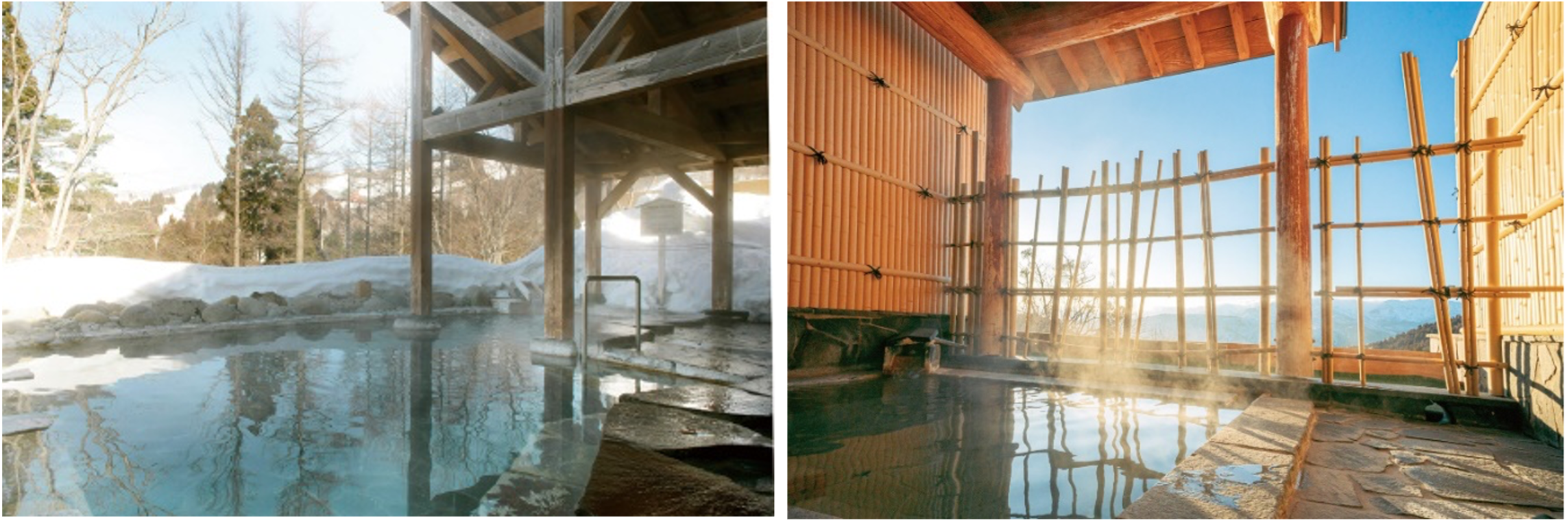 ゆったりとおくつろぎいただける200名収容の「本館」では、露天風呂、内風呂、サウナ完備。冬は雪景色、そして夜は、満天の星空を眺めることができます。泉質も美肌の湯でお肌がつるつるになると好評です。個室露天風呂も10室あり、ご家族で安心してご利用いただけます。