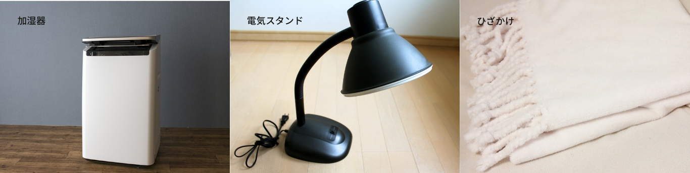 加湿器、電気スタンド、ひざかけなど、冬場の健康管理にかかせないアイテムの無料貸し出しも行います。