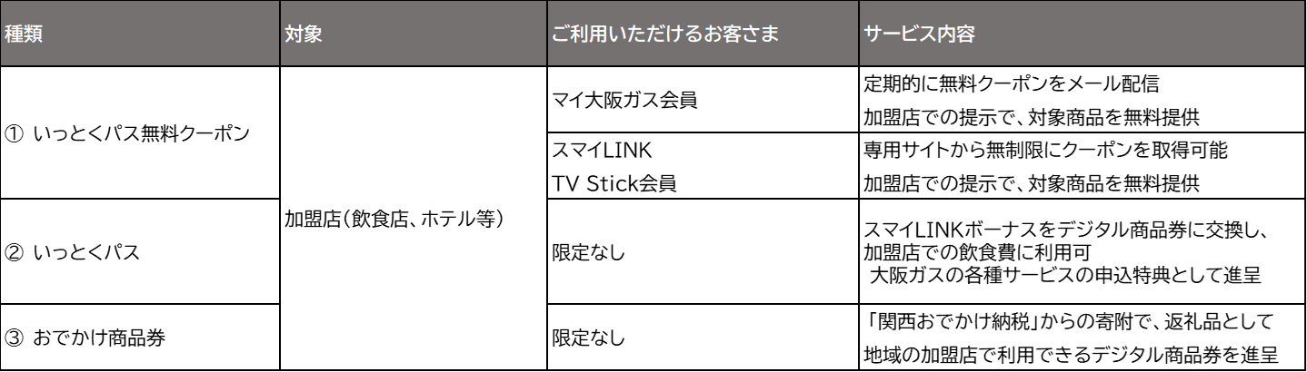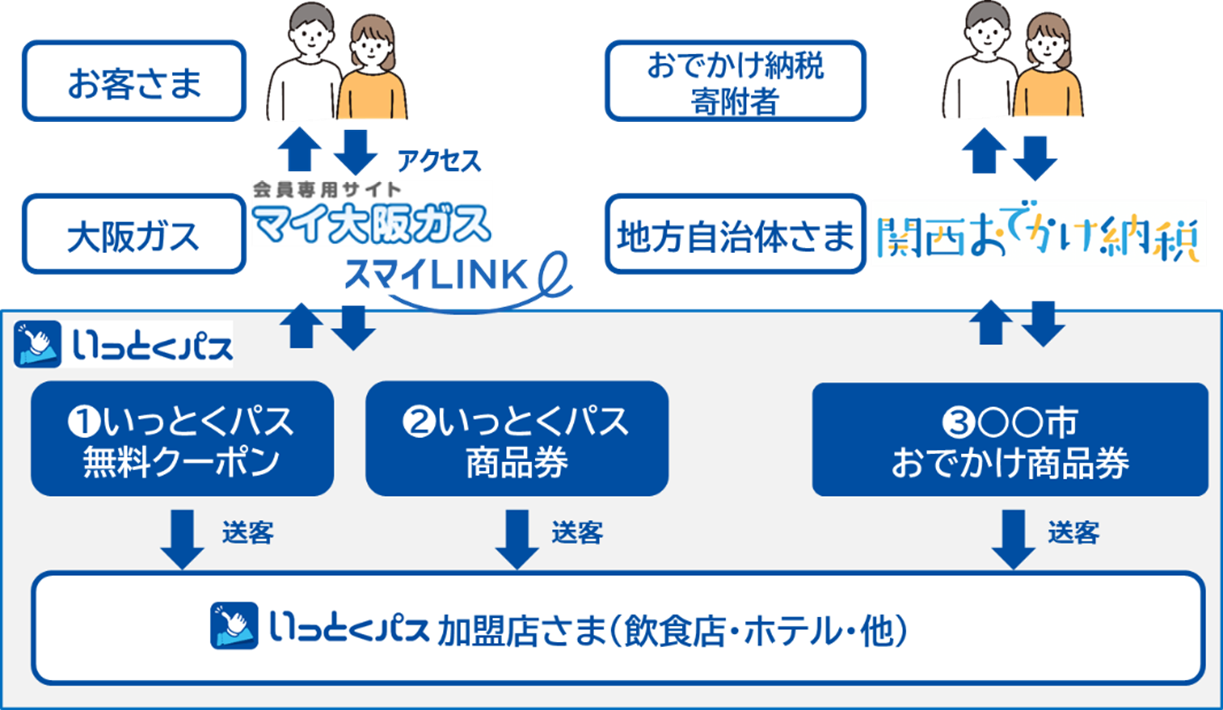 「いっとくパス」とは、大阪ガスが運営する、家庭用のお客さまと飲食店等をつなぐデジタルチケットサービスです。運用基盤として「e街プラットフォーム®️」(運営:株式会社ギフティ)を活用しています。無料クーポンの配布やポイントによるデジタル商品券への交換等を通じて、加盟店で飲食等をお得に楽しんでいただけます。また、本デジタルインフラを活用し、現地消費型のふるさと納税である「関西おでかけ納税」およびその返礼品として地域の飲食店等で利用できる電子商品券「おでかけ商品券」も発行されています。