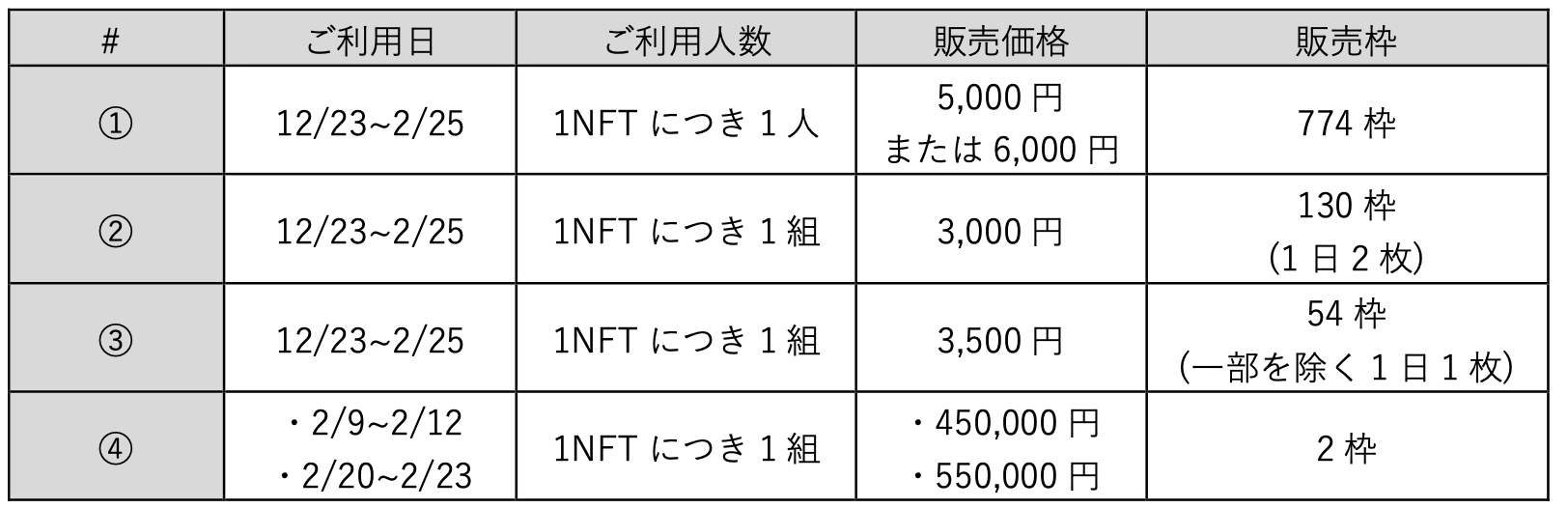 本取組みは、昨年度実証実験として販売したスキー場のアーリーエントリー権が付与されたNFT「ニセコパウダートークン」販売に続く第二弾です。昨年度は、スキー場でのアーリーエントリーのみでしたが、本年度販売する「Niseko Powder Token2.0」は、地域との連携を強化し地元店舗の予約権利をNFT化したことに加え、スキー場におけるスキー・スノボ、レストラン、バー、宿泊といったニセコに訪れる方の一連の利用体験をNFT化することで、新たな体験を創出した取組みとなっております。