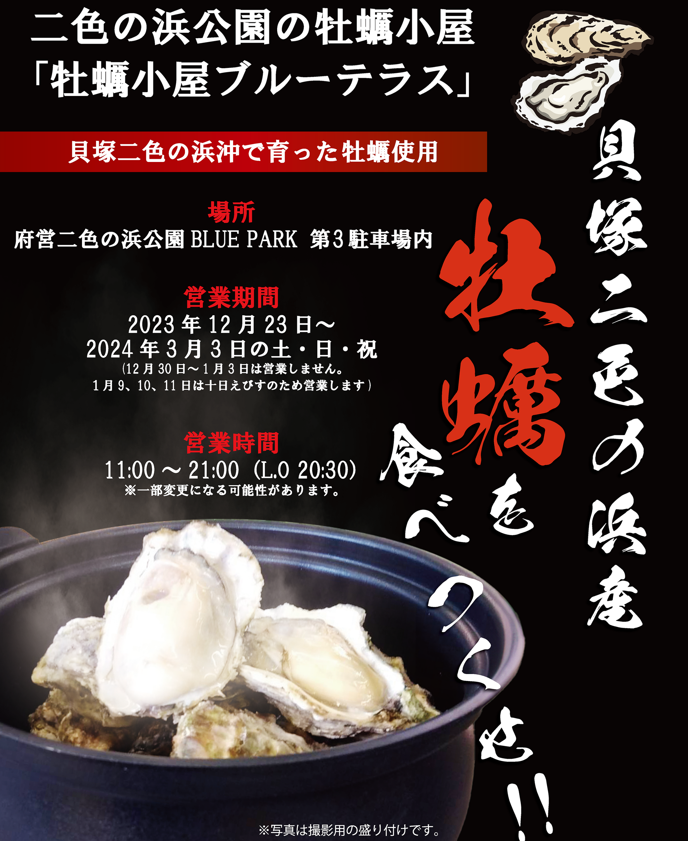 府営二色の浜公園BLUE PARK(府営二色の浜公園指定管理者:二色の浜リバイバル・プロジェクトグループ)は、貝塚二色の浜沖で育った牡蠣を提供する「牡蠣小屋ブルーテラス」を二色の浜公園第3駐車場内で期間限定営業致します。