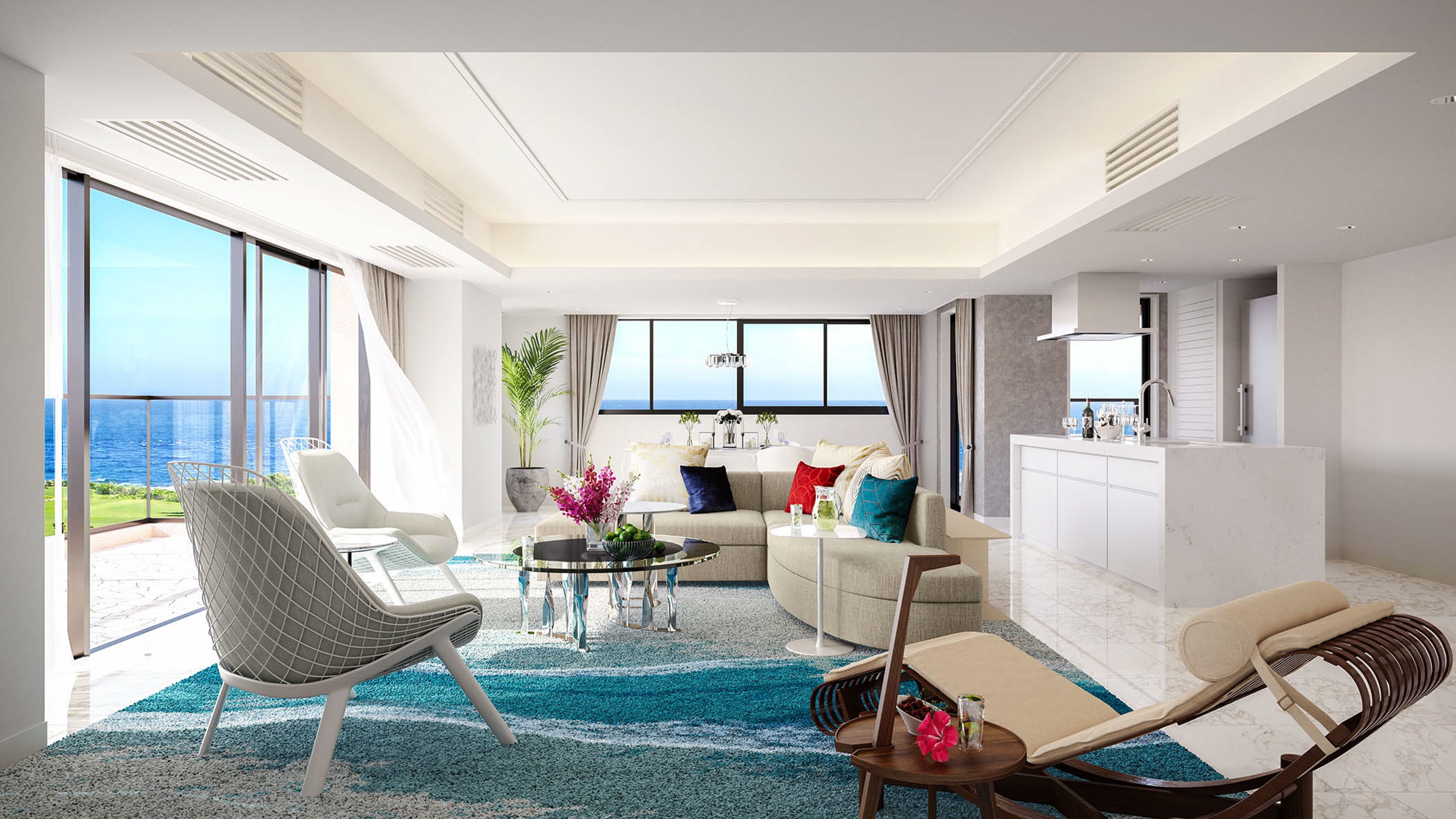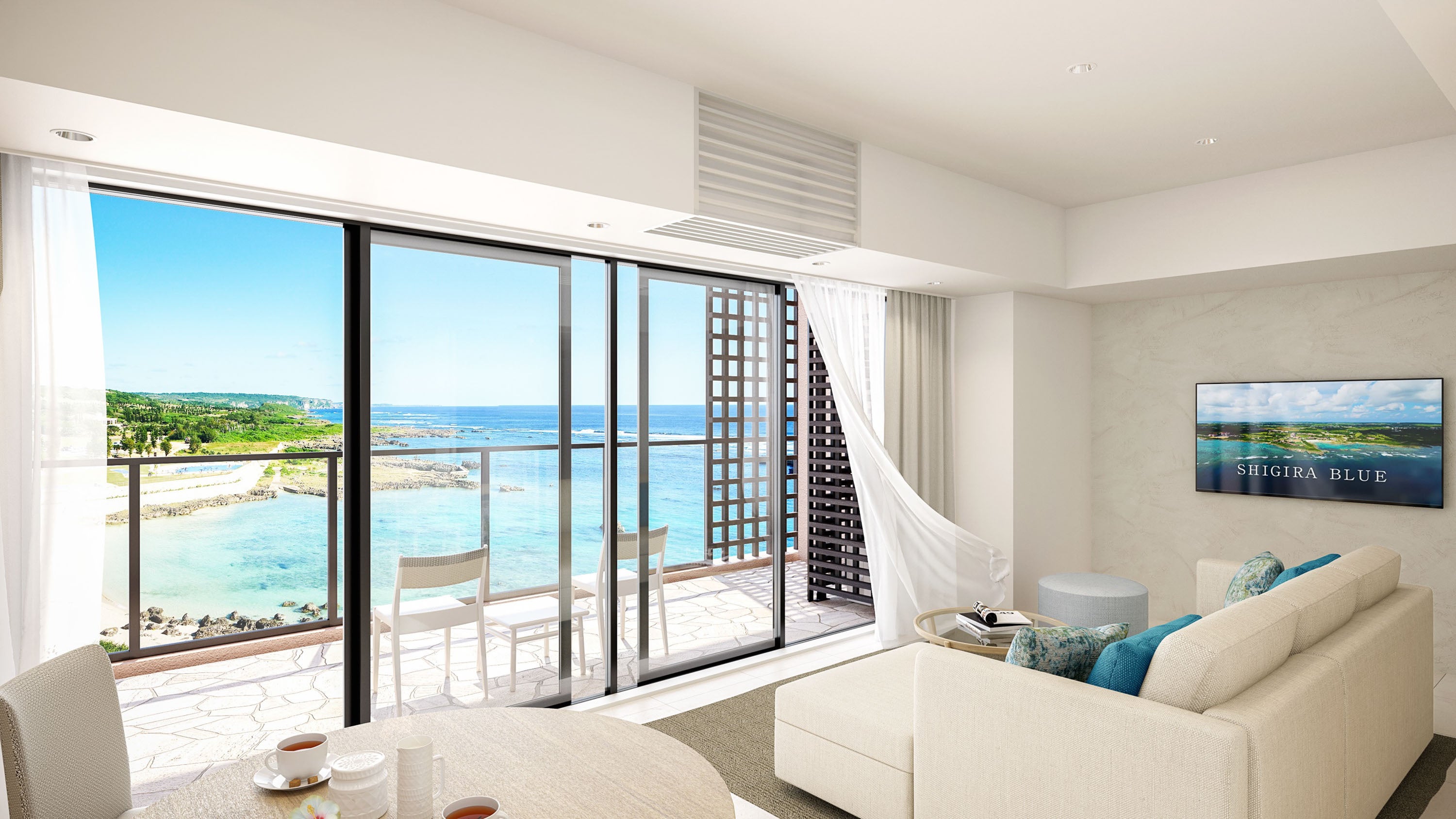 客室は、暮らすように滞在するための“ゲストハウス”。「カッシーナ・イクスシー」の監修にてセレクトした家具を中心に、白砂と紺碧をモチーフに仕立てたアーバンモダンなインテリアとともに、全室にハイグレードなキッチンとリビングダイニングを配置するなど、長期滞在の旅にも〈上質なリゾートライフの最適解〉となる備えを充実させております。またオーシャンビューの広々としたテラスバルコニーからは、雄大な海を楽しむことができます。