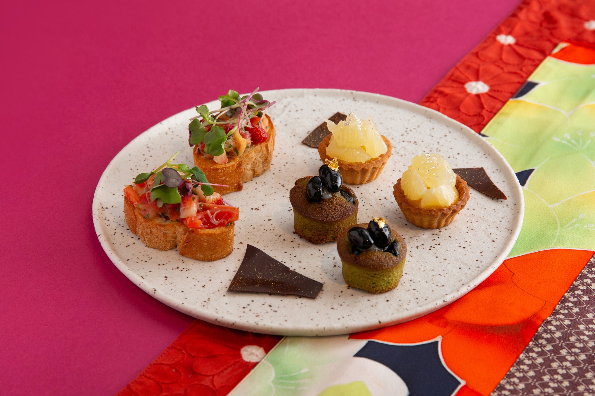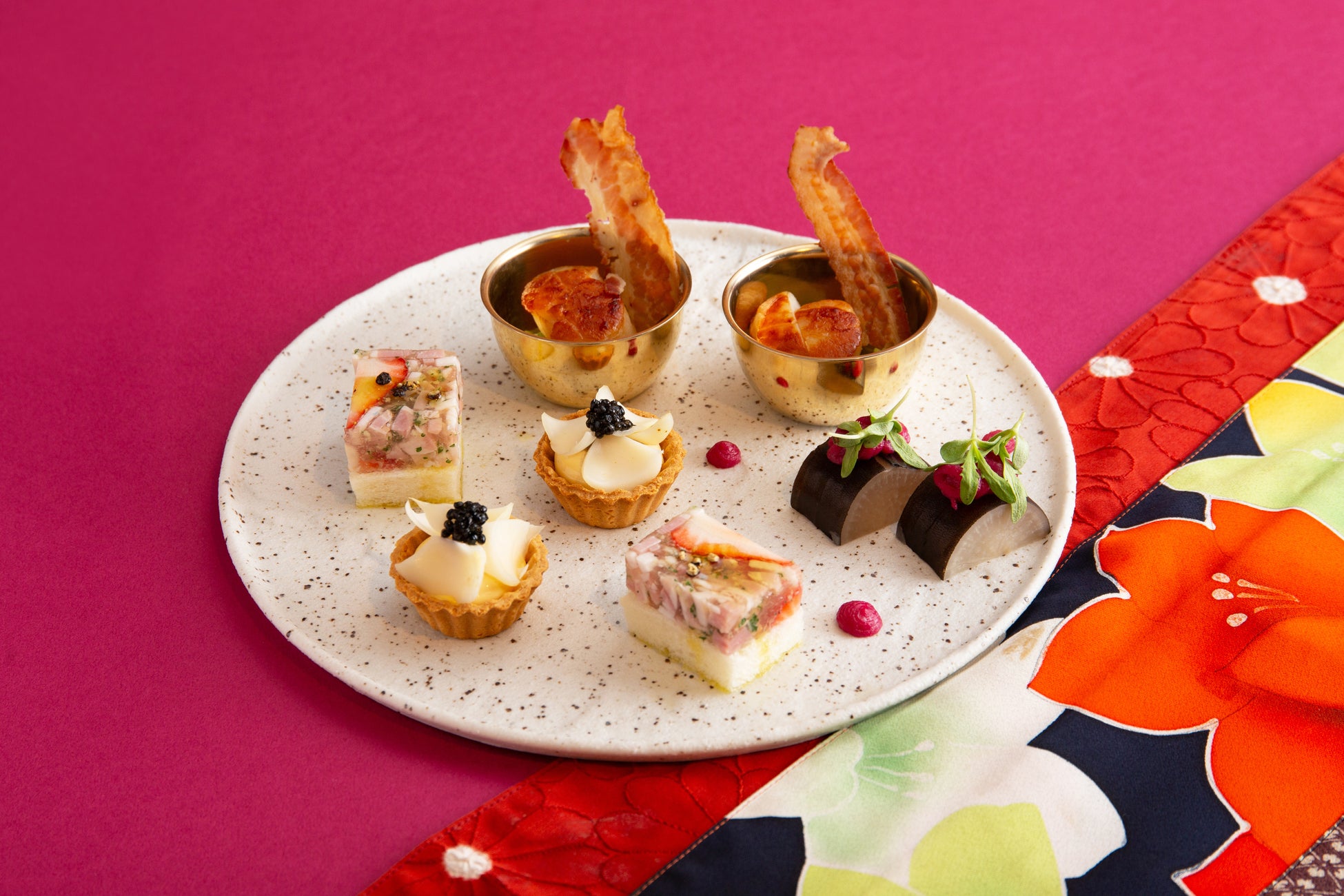 2024年を迎えるこのシーズンにふさわしく、雪の結晶のデコレーションされたラズベリーヴェリーヌ、健康やまめに動ける願いをこめた黒豆抹茶ケーキ、旬を迎える文旦タルトなどのスイーツに加え、いちごと蟹のオープンサンド、キャビアと百合根のタルト カマンベールクリーム、帆立貝のポワレ サボイキャベツとベーコンといった旬の素材や豪華な食材を取り入れたシェフのアイデアが光るセイボリーも揃います。