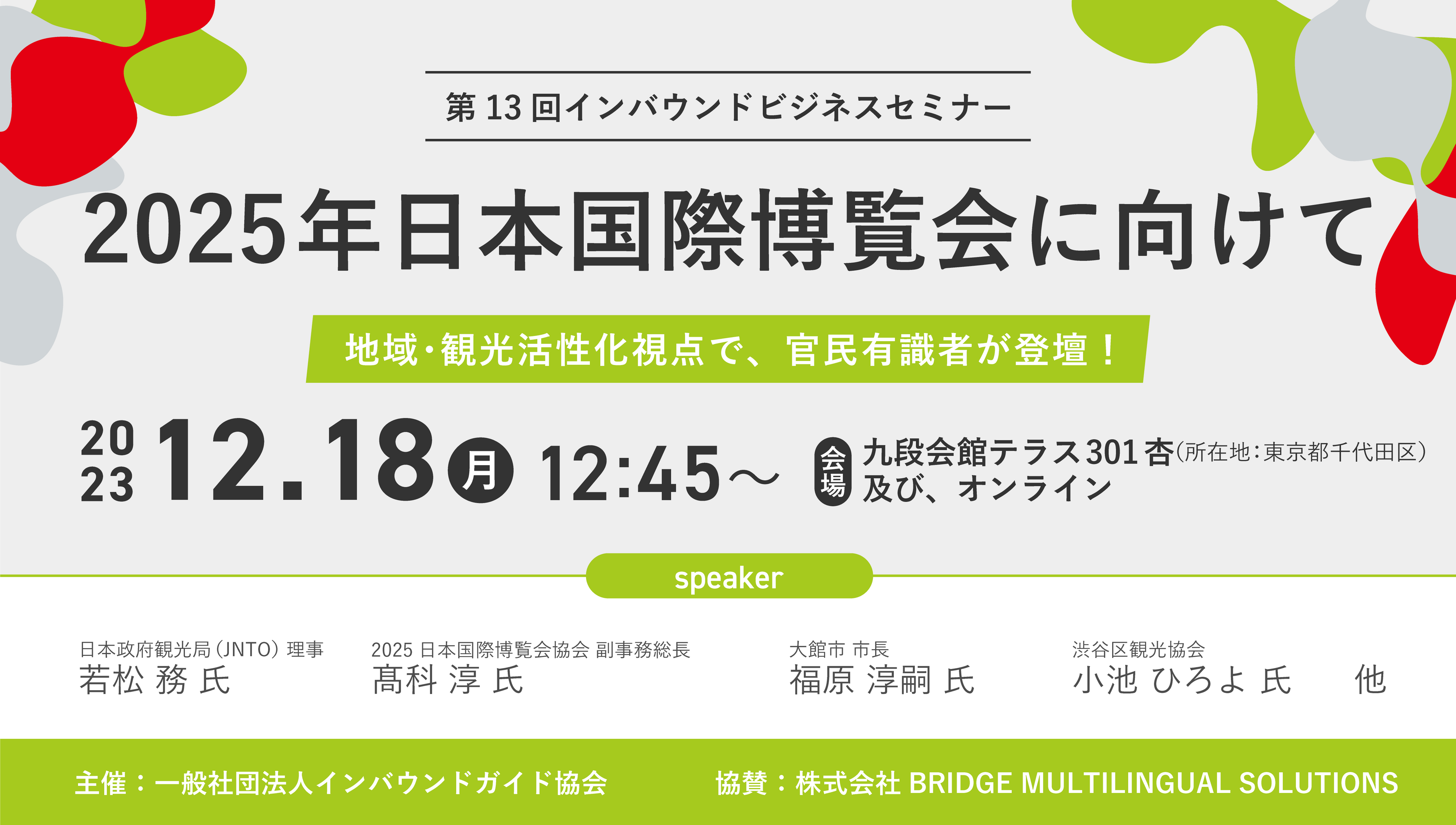 登壇|日本政府観光局(JNTO)理事 若松 務氏、2025日本国際博覧会協会 副事務総長 髙科 淳氏、大館市 市長 福原 淳嗣氏、渋谷区観光協会 小池 ひろよ氏ほか