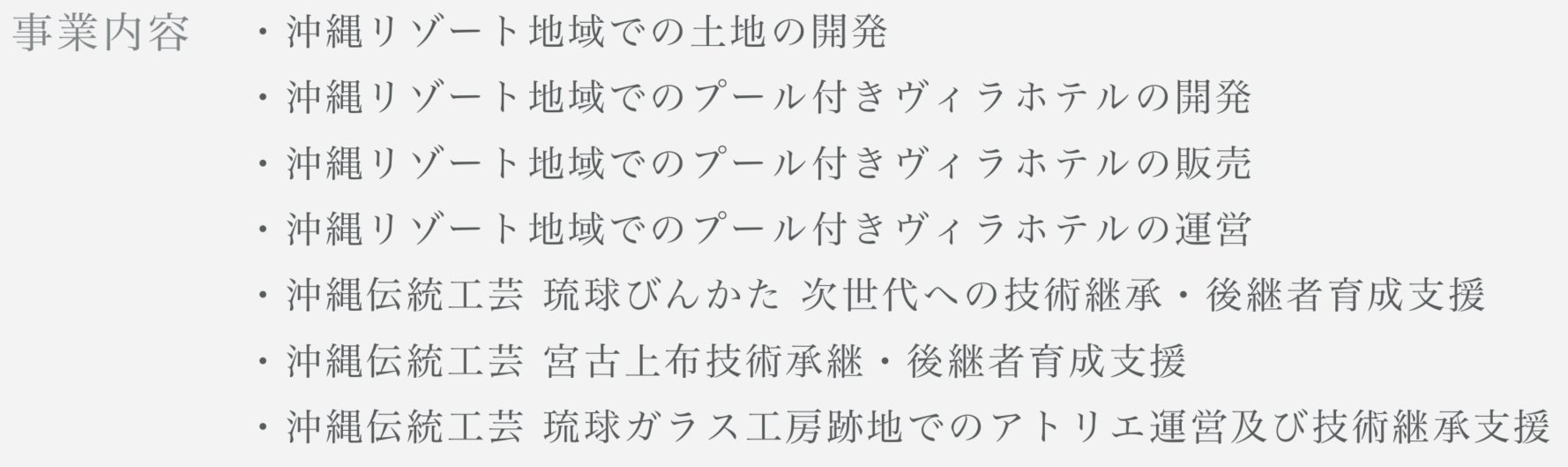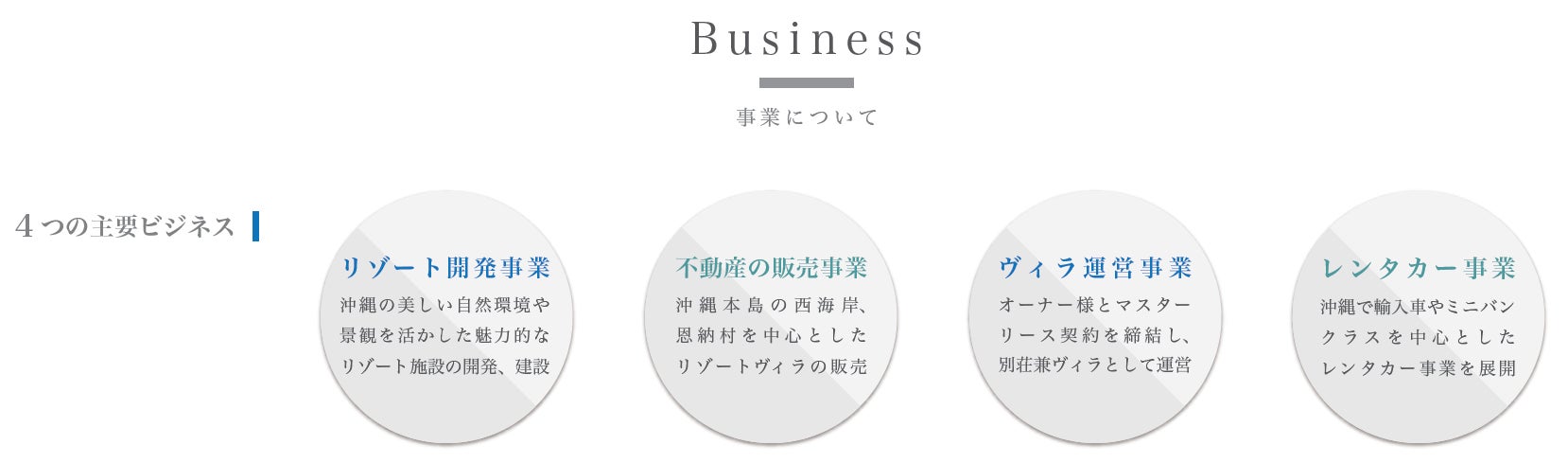 沖縄リアルターは、沖縄県、東京都、及び、複数のリゾート地にてインバウンドをメインターゲットとしたリゾート開発や宿泊施設の提供をおこなっています。沖縄でのプール付きヴィラホテルの企画販売、ホテルオペレーション、コロナ禍で日本に根付いたテレワーク環境を前提としたデュアルライフxデュアルインカムをはじめ、沖縄におけるメディカルツーリズムの追及、リゾートウェディングの企画開発、大手資格試験専門学校との提携による企画型社員研修旅行の提案販売等、多岐にわたる事業展開をしている進取の精神に富む企業です。上記事業群との高いシナジーの見込めるリゾートレンタカー事業への取り組みにも力を入れています。