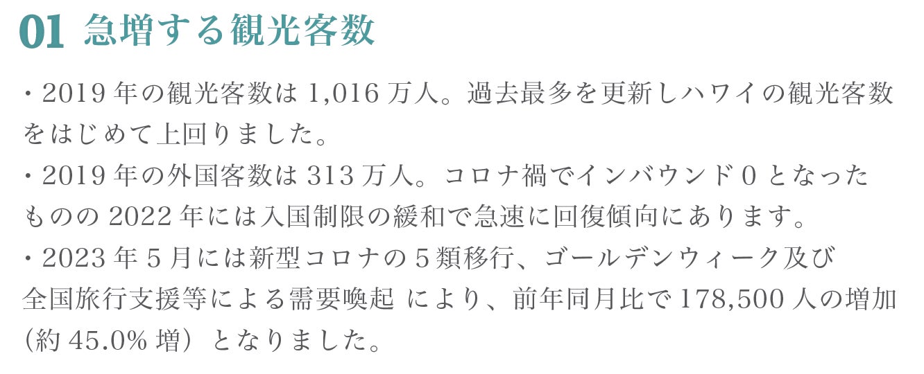 ●積極的な外国人観光客向けマーケティング施策を展開し、観光客数ハワイ超え期待の沖縄でインバウンドビジネスに照準
