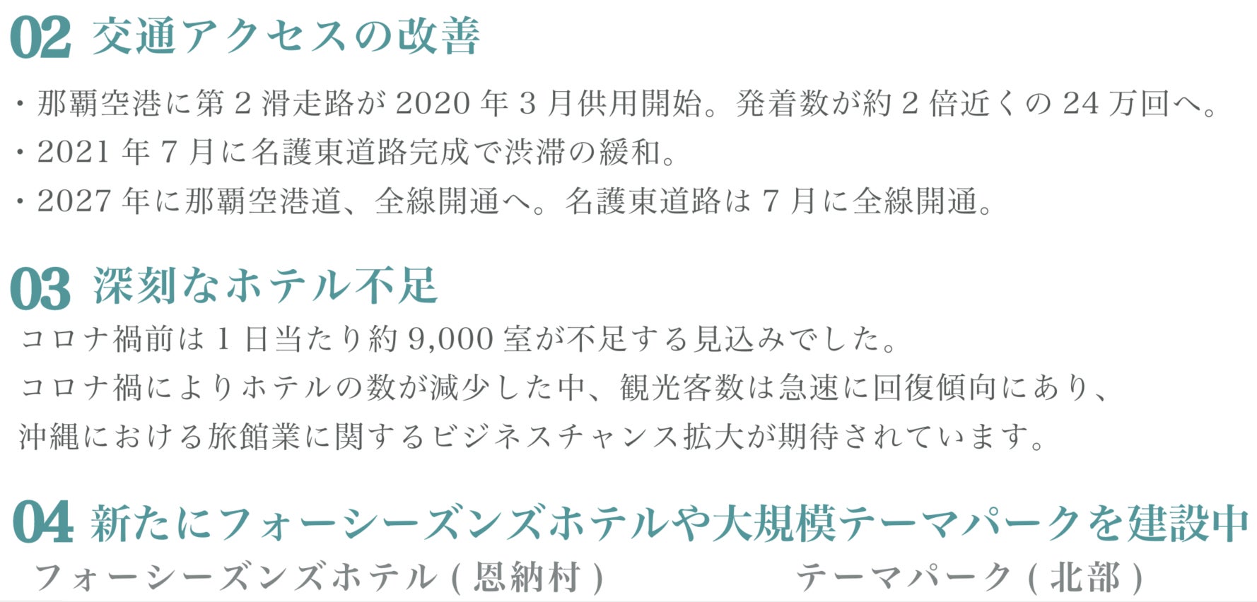 「フォーシーズンズ・リゾート・アンド・プライベート・レジデンス沖縄(仮称)」のコンドミニアム124室の計画と時を同じくしての発表(本年10月31日)となった。この事実は世界のラグジュアリーホテルからも沖縄恩納村のポテンシャルと将来についてのコミットメントを獲得していることを示している。