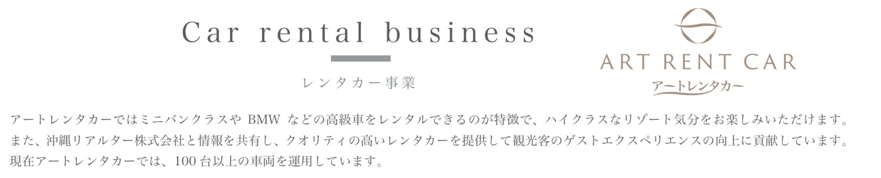 ●(5) インバウンド向けハイヤー・レンタカー企業との提携:弊社の関連会社であるアートレンタカーを含め、沖縄でレンタカー・ハイヤー事業を運営する数社と業務提携を行いインバウンド向けにハイヤー・レンタカーの提供を行います。とくに日本国内で現地運転免許証が有効でない中国を始めとした海外富裕層向けには専属ドライバー付きのハイヤーサービスを提供することで沖縄恩納村へのインバウンド観光客誘致を実現します。また客層に合わせたサービス提供ができるようコンパクトカーからBMW等の輸入車やアルファード・ヴェルファイア等のミニバンクラスまで対応できるよう幅広いサービス提供ができるよう受入体制を構築しています。