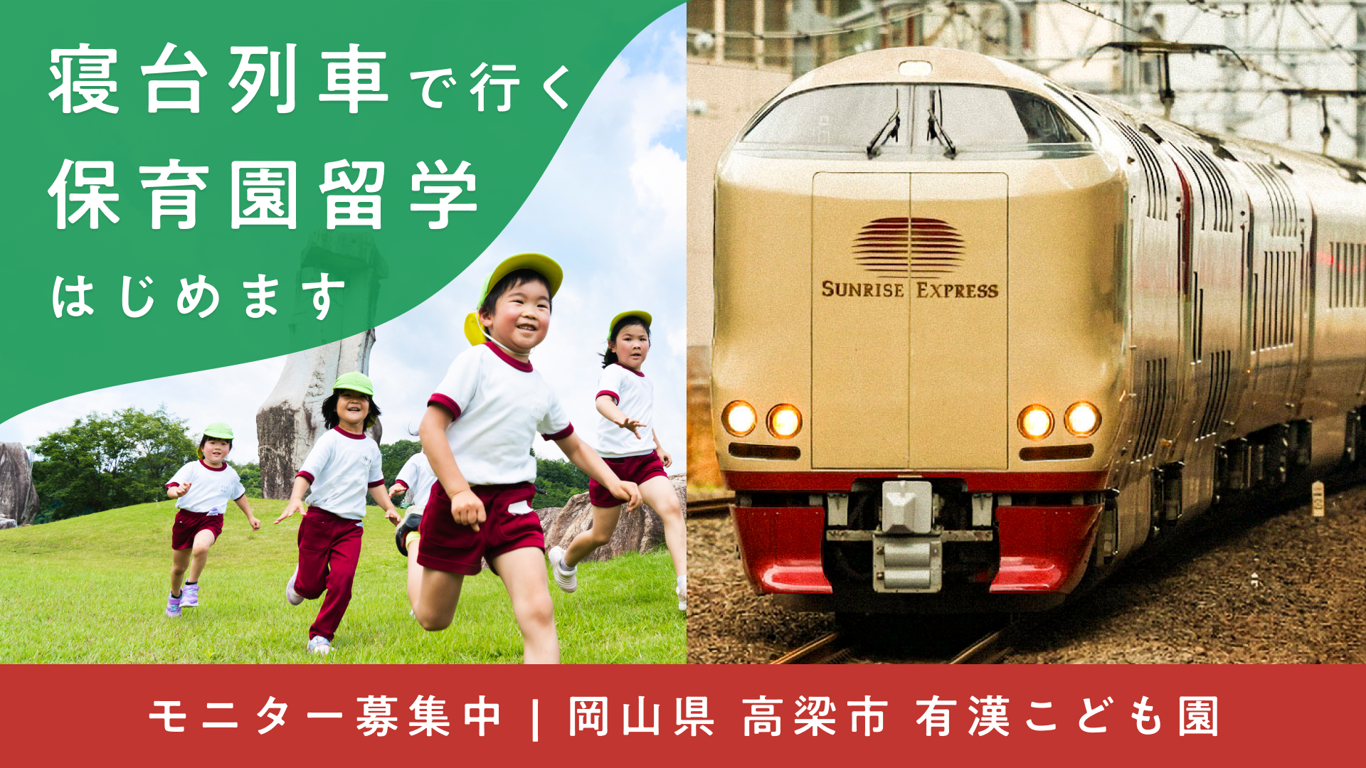 東京方面から寝台列車「サンライズ瀬戸・出雲」に乗って行く、岡山県高梁市(たかはしし)・有漢(うかん)こども園への移動付き保育園留学プランとなります。